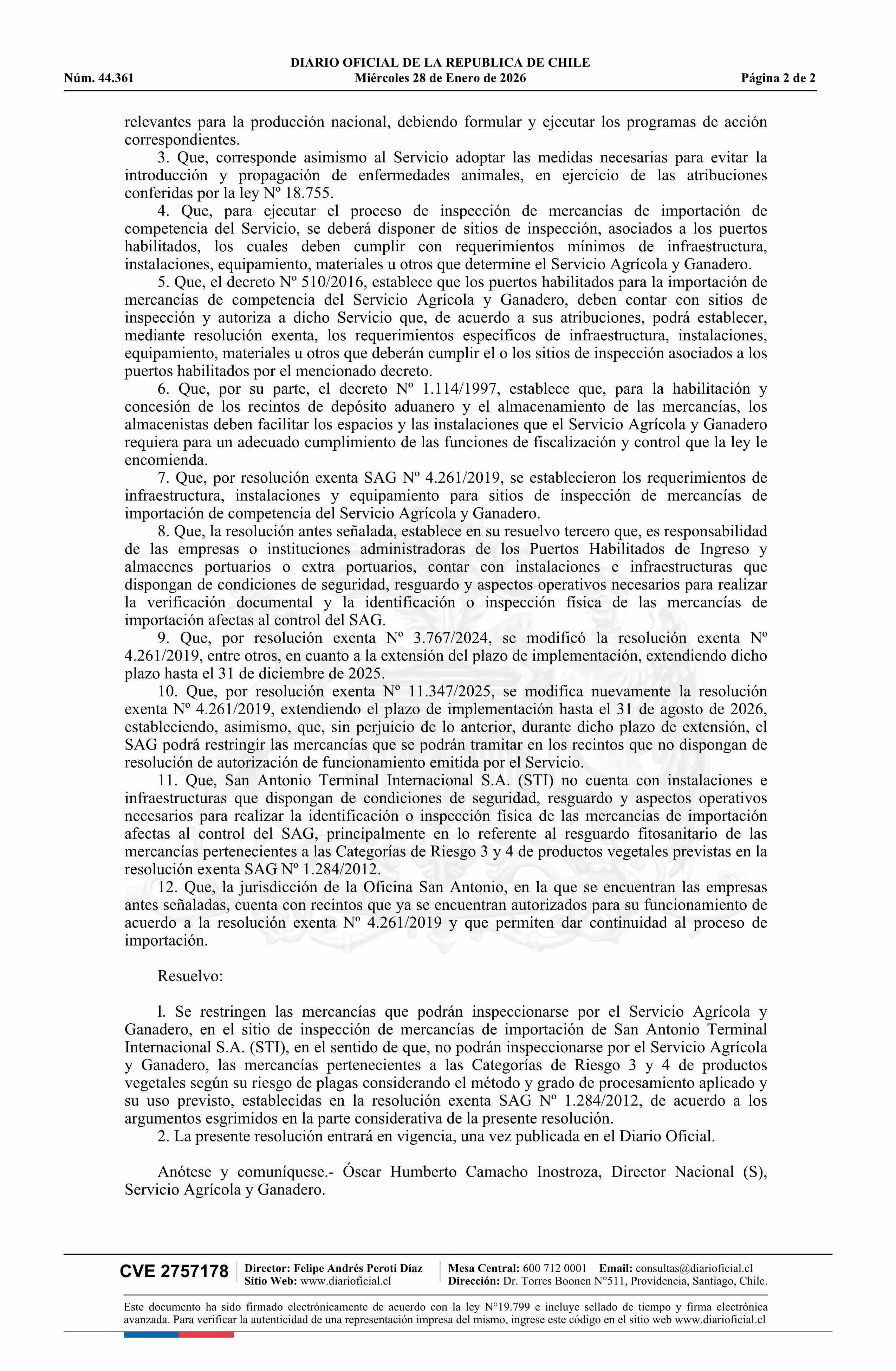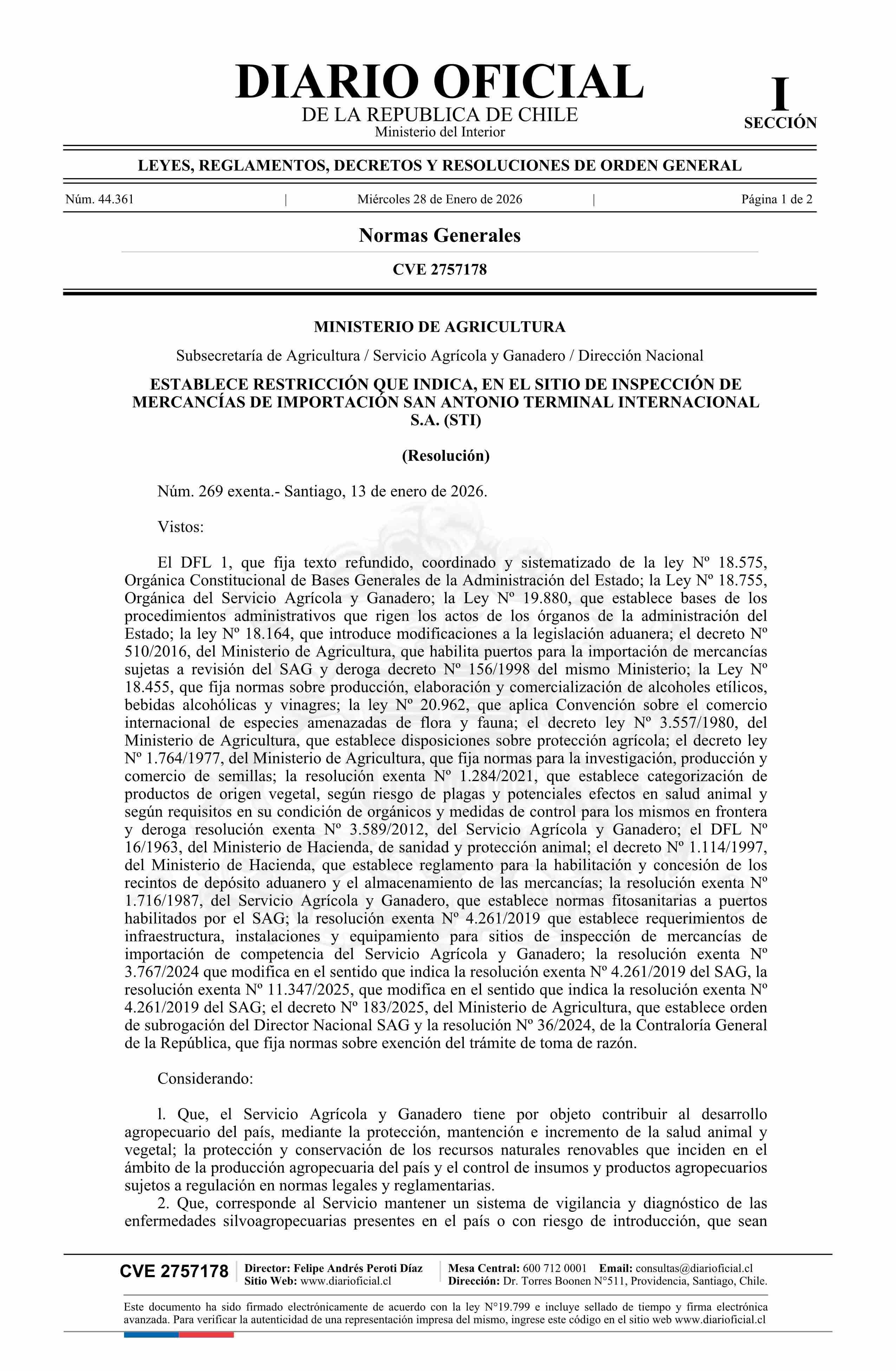 | Título: | Resolución exenta número 269, de 2026.- Establece restricción que indica, en el sitio de inspección de mercancías de importación San Antonio Terminal Internacional S.A. (STI) |
