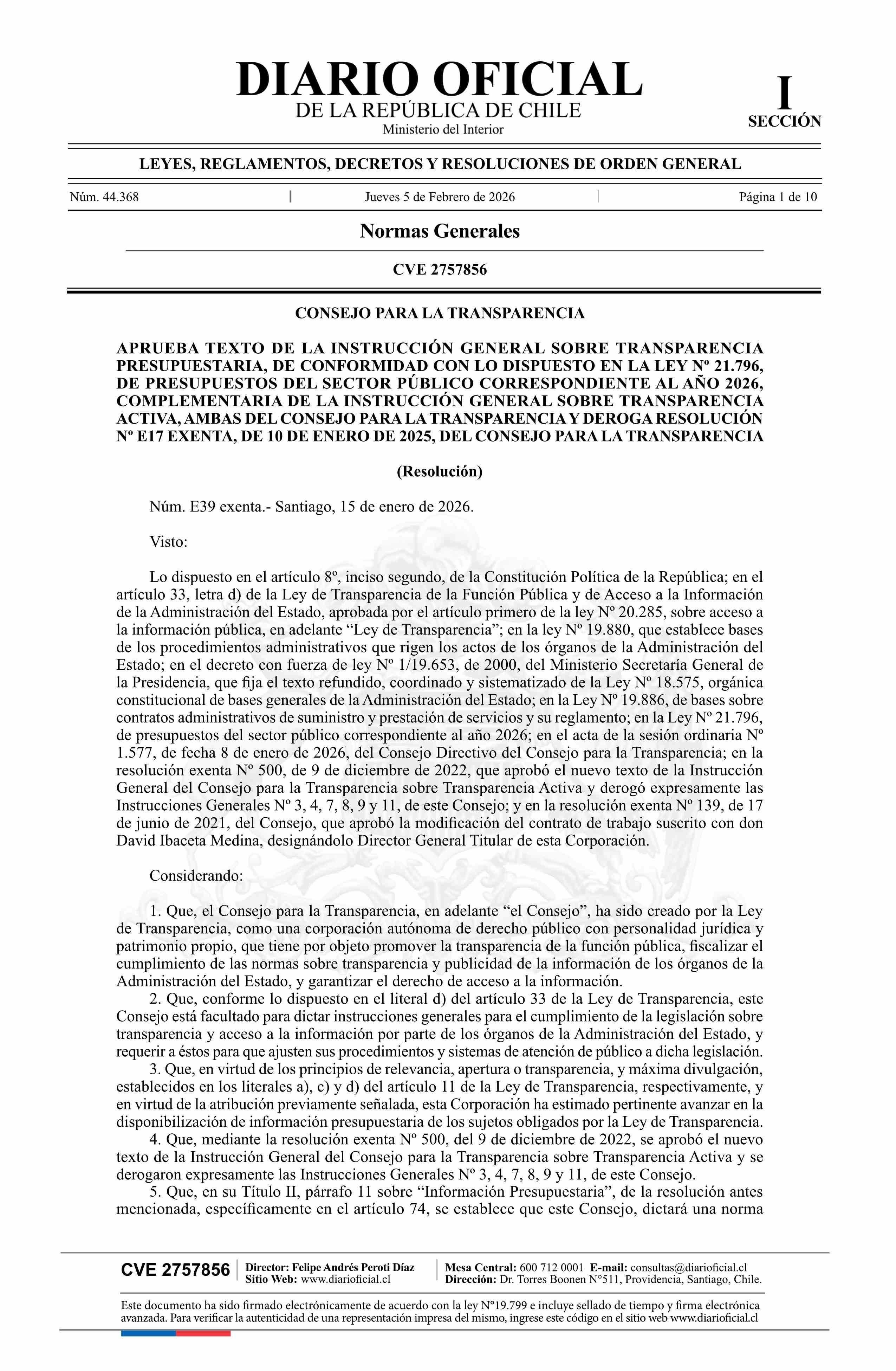 | Título: | Resolución exenta número E39, de 2026.- Aprueba texto de la Instrucción General sobre Transparencia Presupuestaria, de conformidad con lo dispuesto en la Ley Nº 21.796, de Presupuestos del Sector Público correspondiente al año 2026, complementaria de la Instrucción General sobre Transparencia Activa |