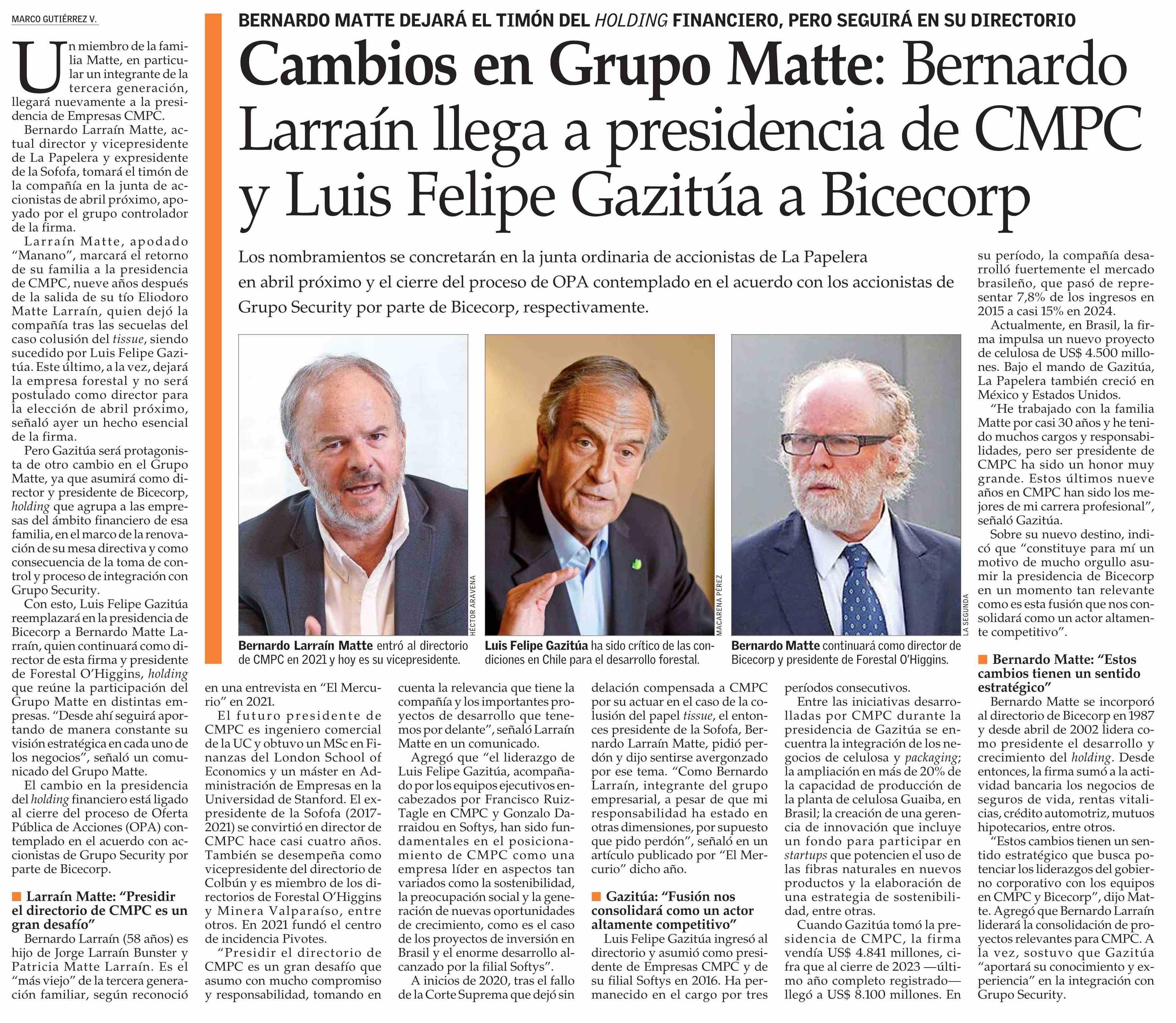 Cambios en Grupo Matte: Bernardo Larraín llega a presidencia de CMPC y Luis Felipe Gazitúa a Bicecorp