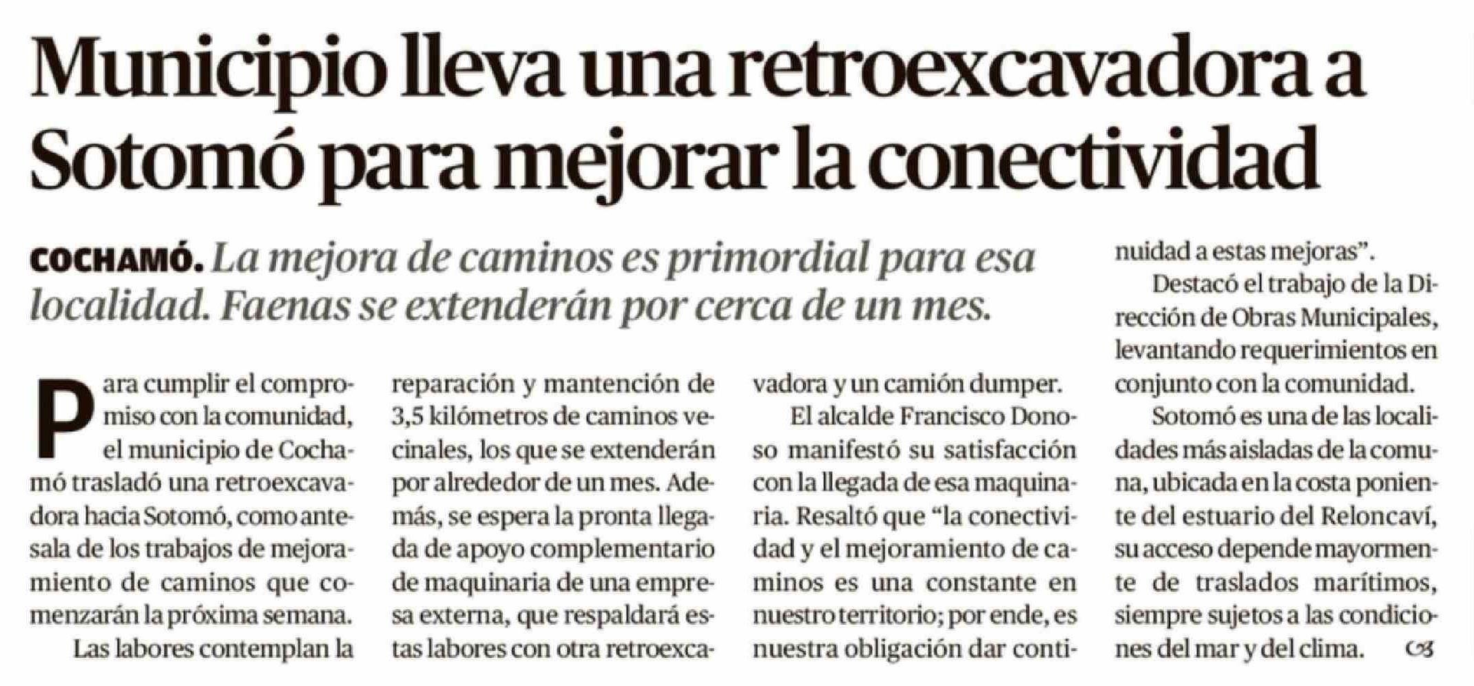Municipio lleva una retroexcavadora a Sotomó para mejorar la conectividad