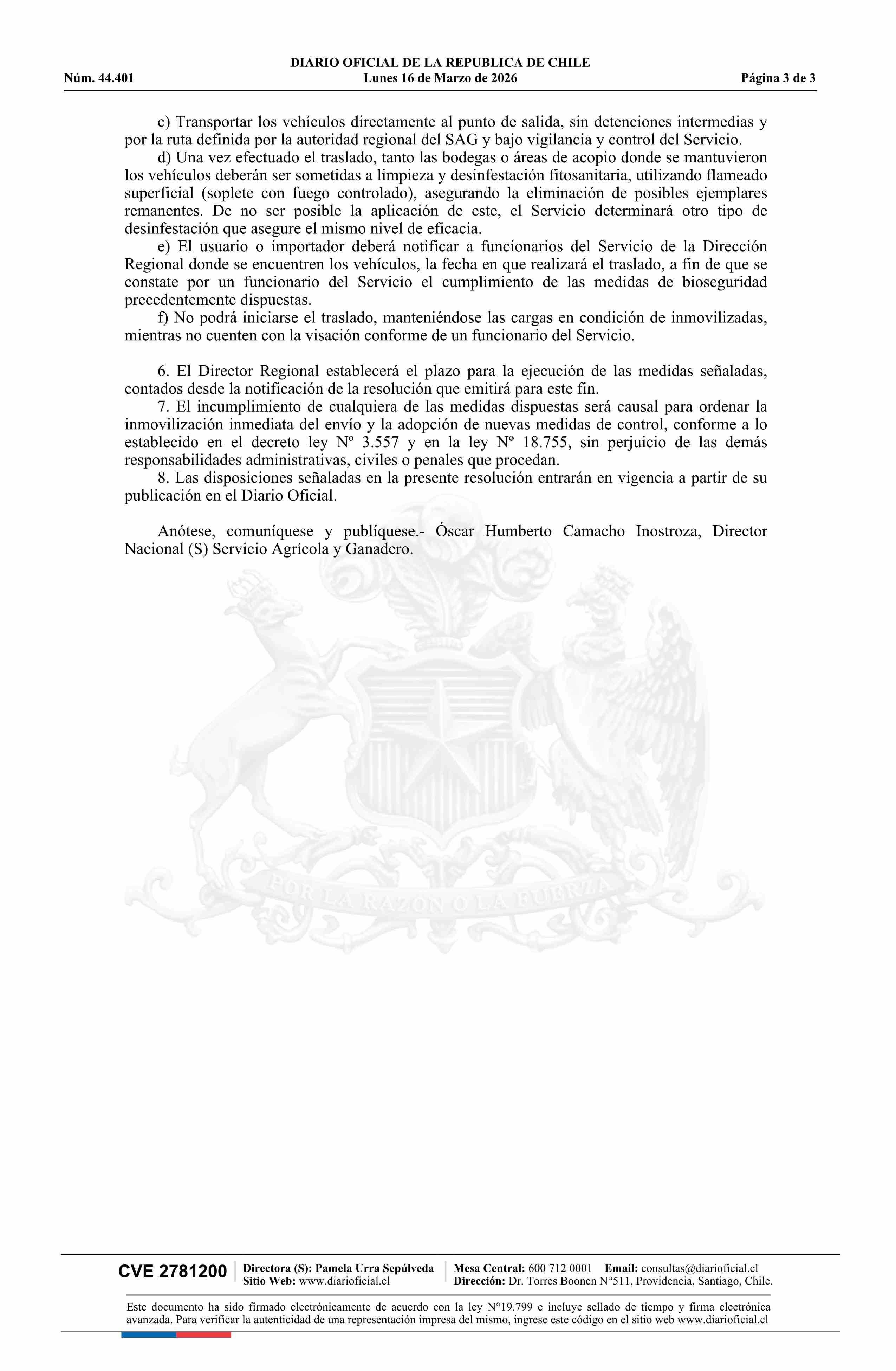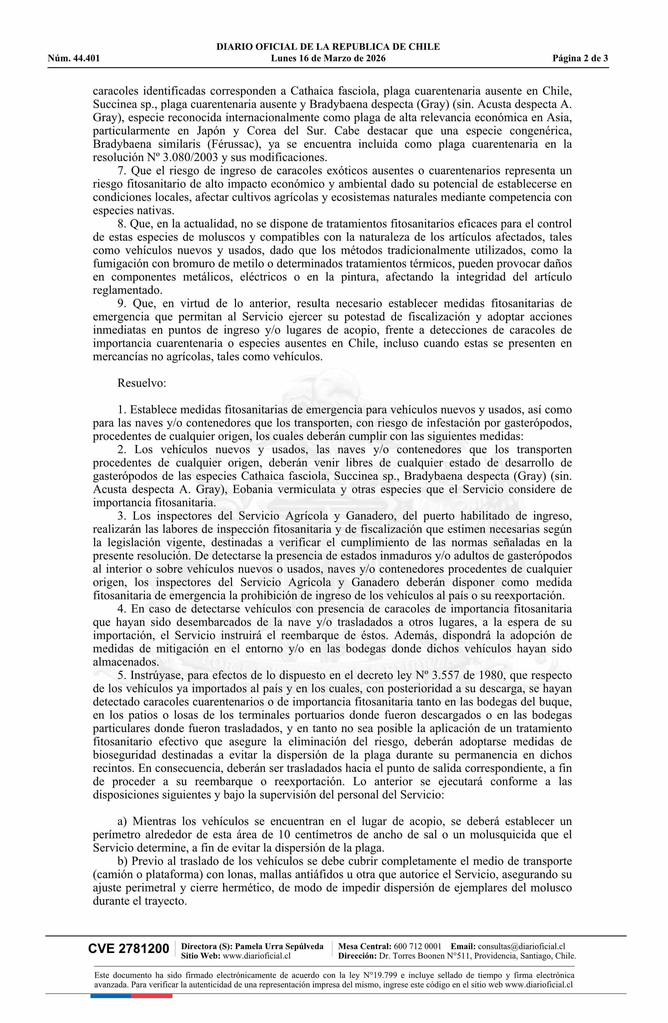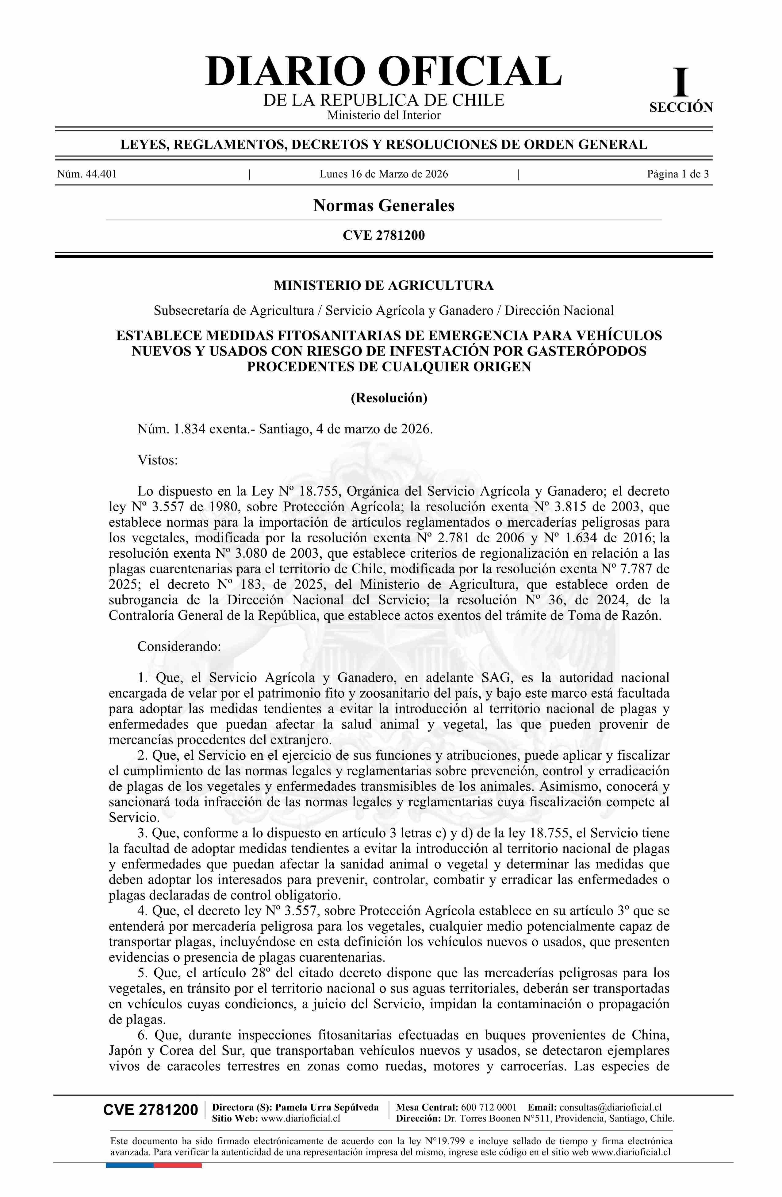 Título: Resolución exenta número 1.834, de 2026.- Establece medidas fitosanitarias de emergencia para vehículos nuevos y usados con riesgo de infestación por gasterópodos procedentes de cualquier origen
