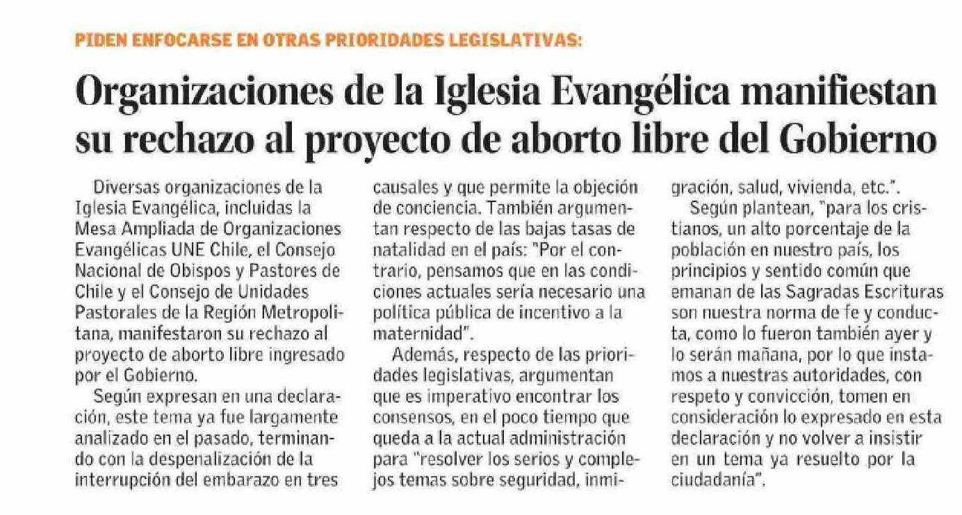 Organizaciones de la Iglesia Evangélica manifiestan su rechazo al proyecto de aborto libre del Gobierno
