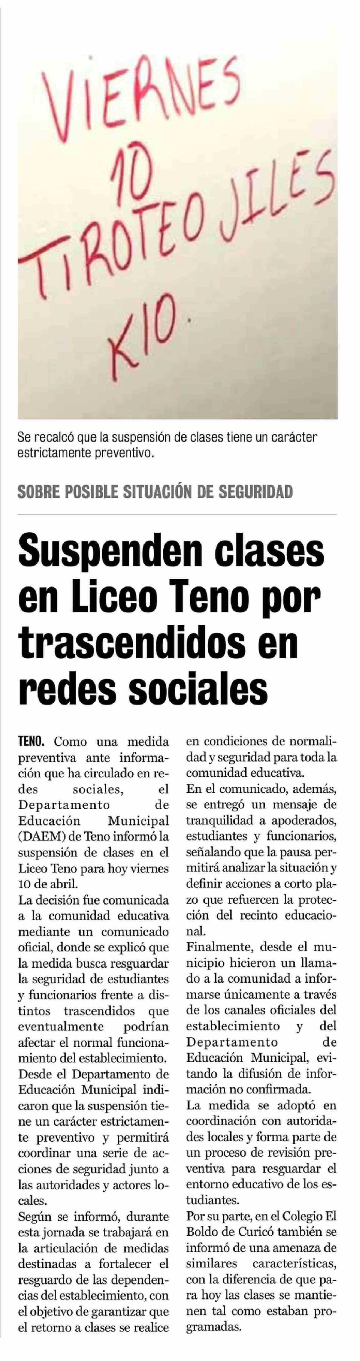 Suspenden clases en Liceo Teno por trascendidos en redes sociales