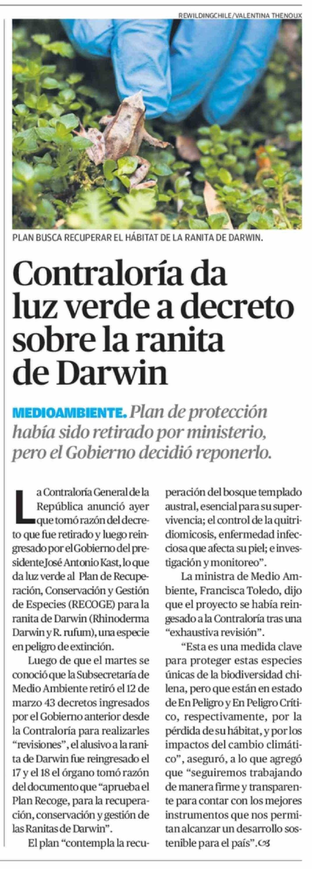 Contraloría da luz verde a decreto sobre la ranita de Darwin