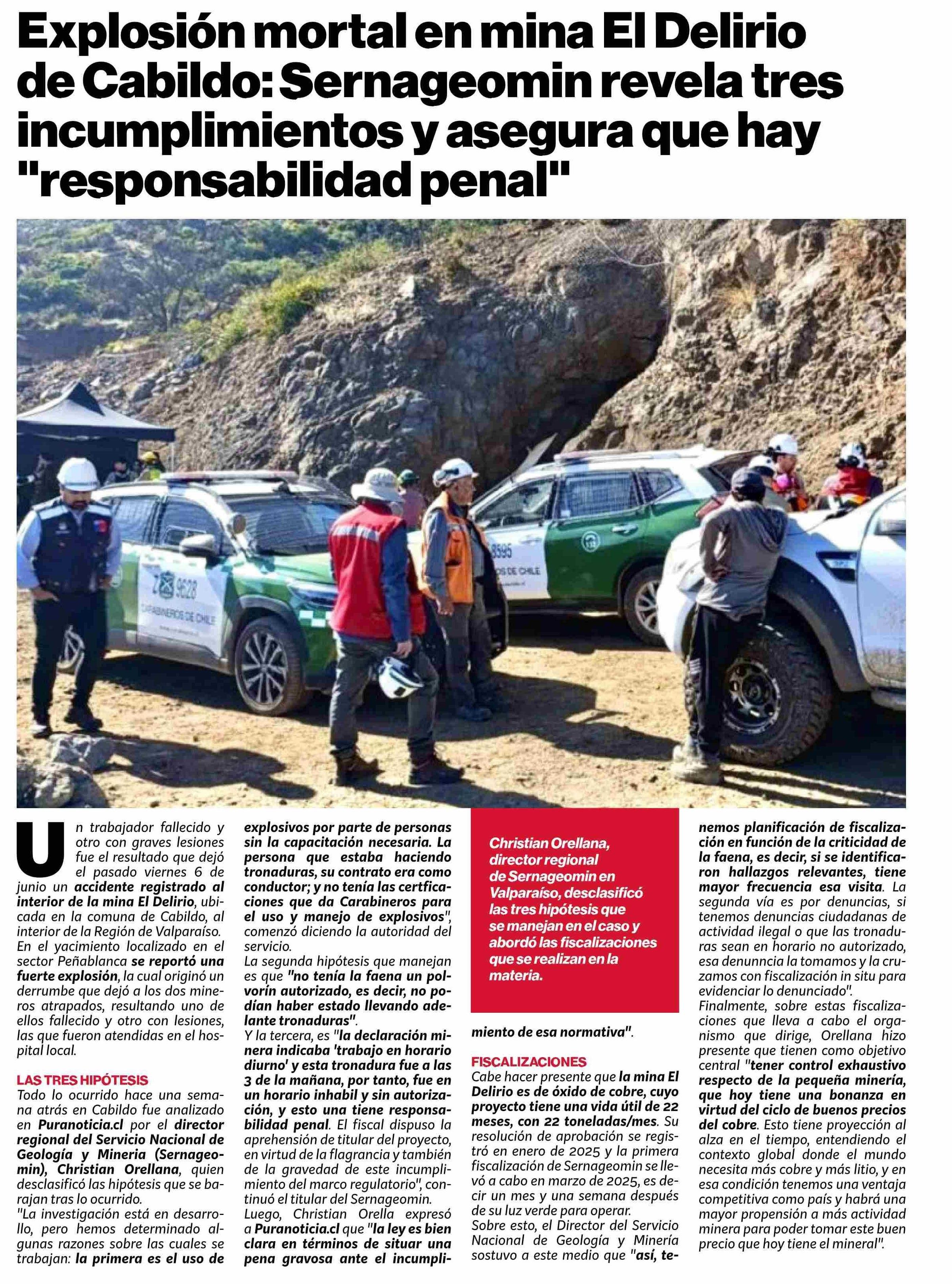 Explosión mortal en mina El Delirio de Cabildo: Sernageomin revela tres incumplimientos y asegura que hay "responsabilidad penal"