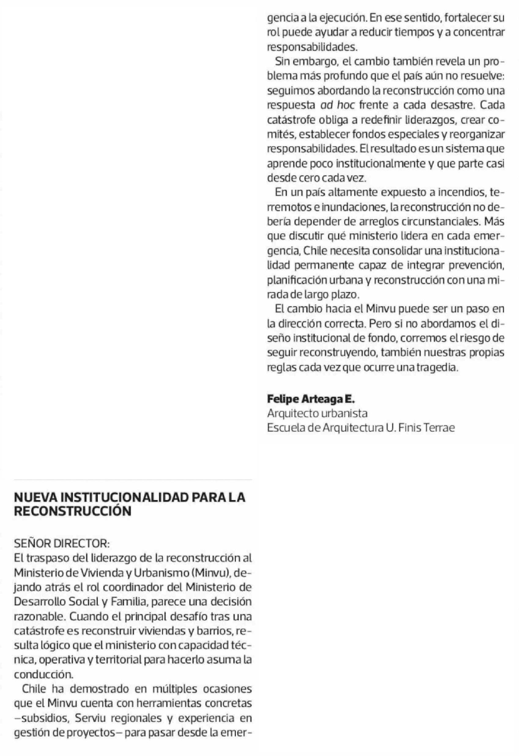 Cartas: NUEVA INSTITUCIONALIDAD PARA LA RECONSTRUCCIÓN
