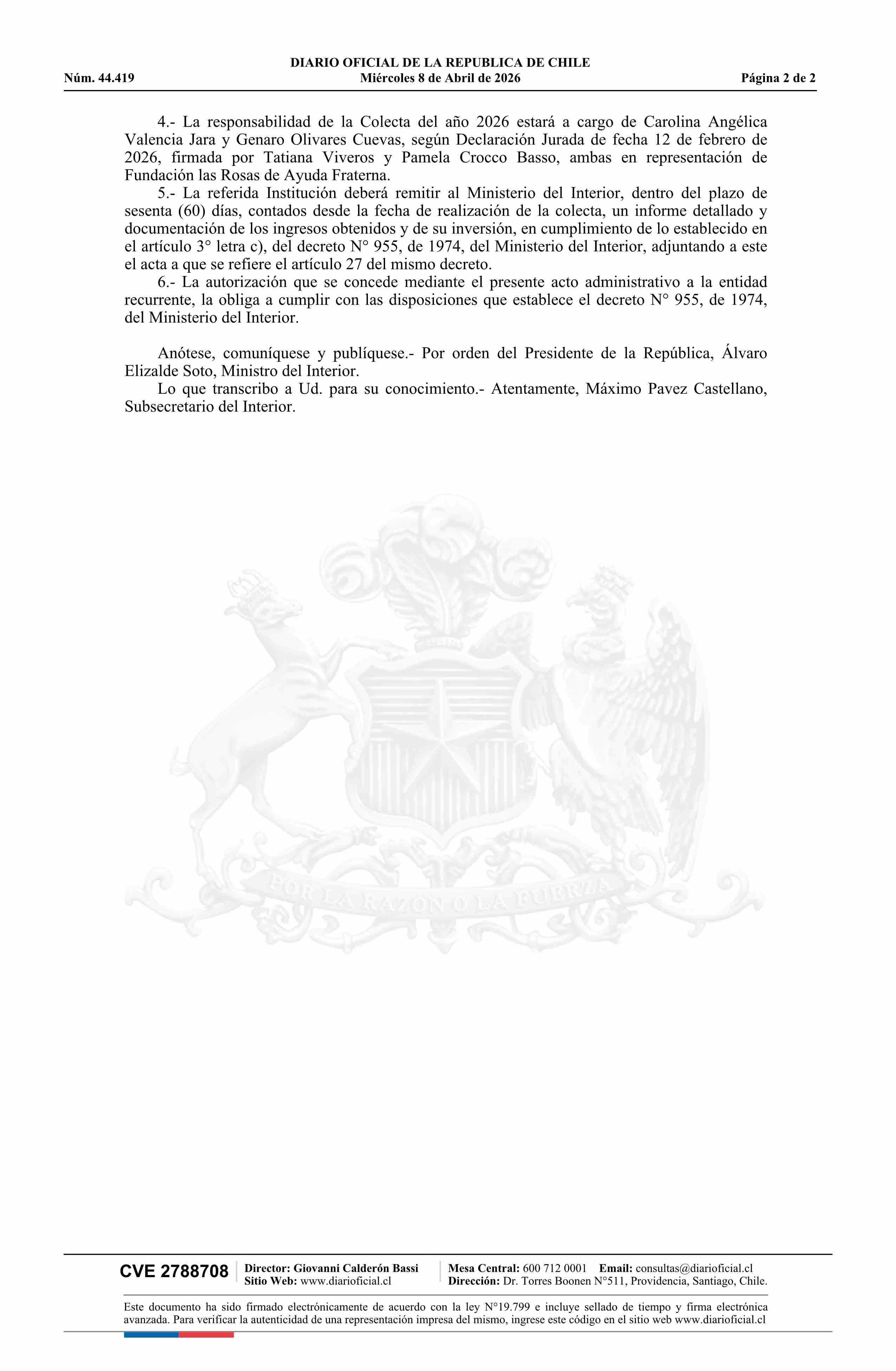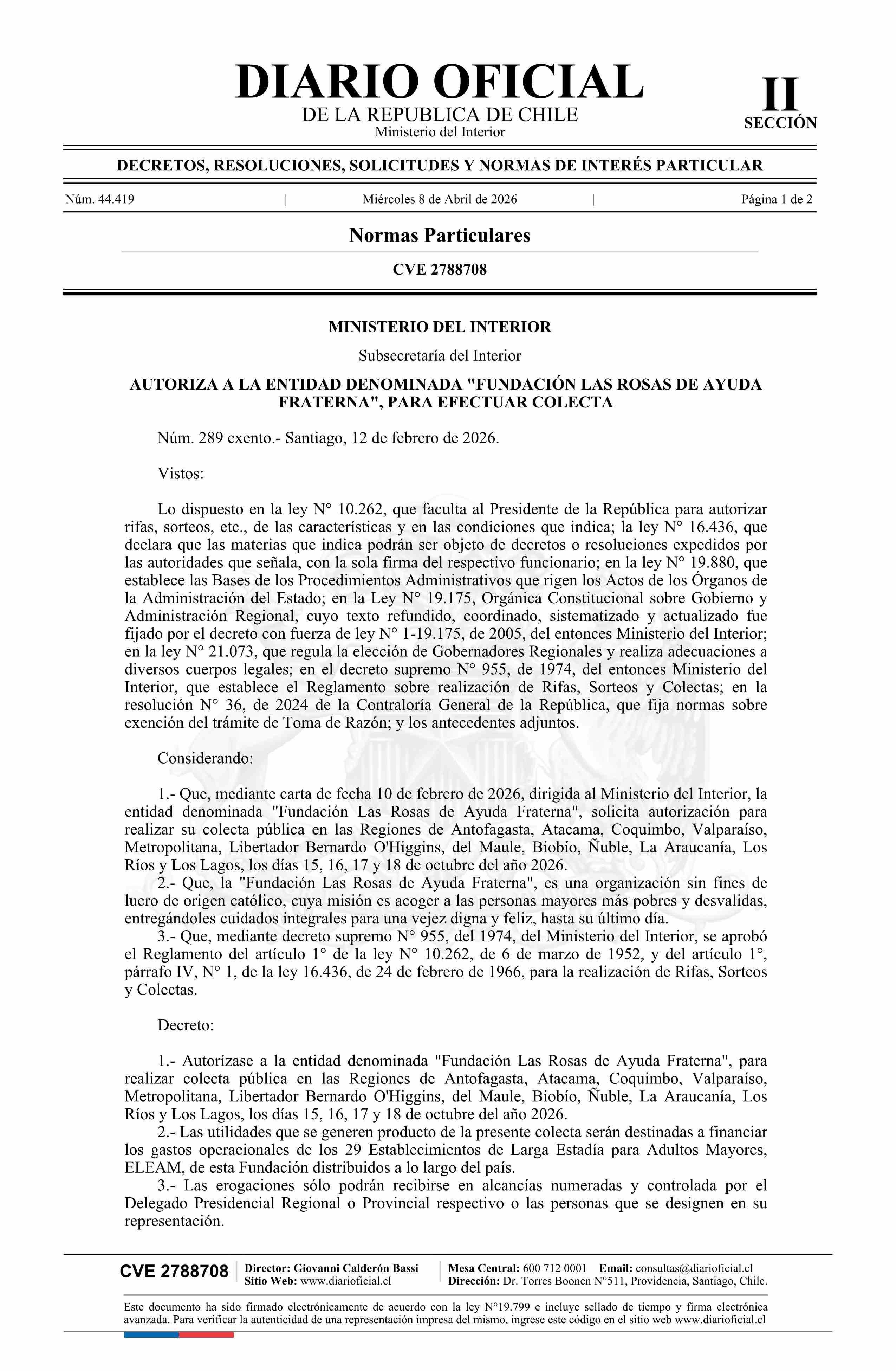 | Título: | Decreto exento número 289, de 2026.- Autoriza a la entidad denominada Fundación Las Rosas de Ayuda Fraterna para efectuar colecta |