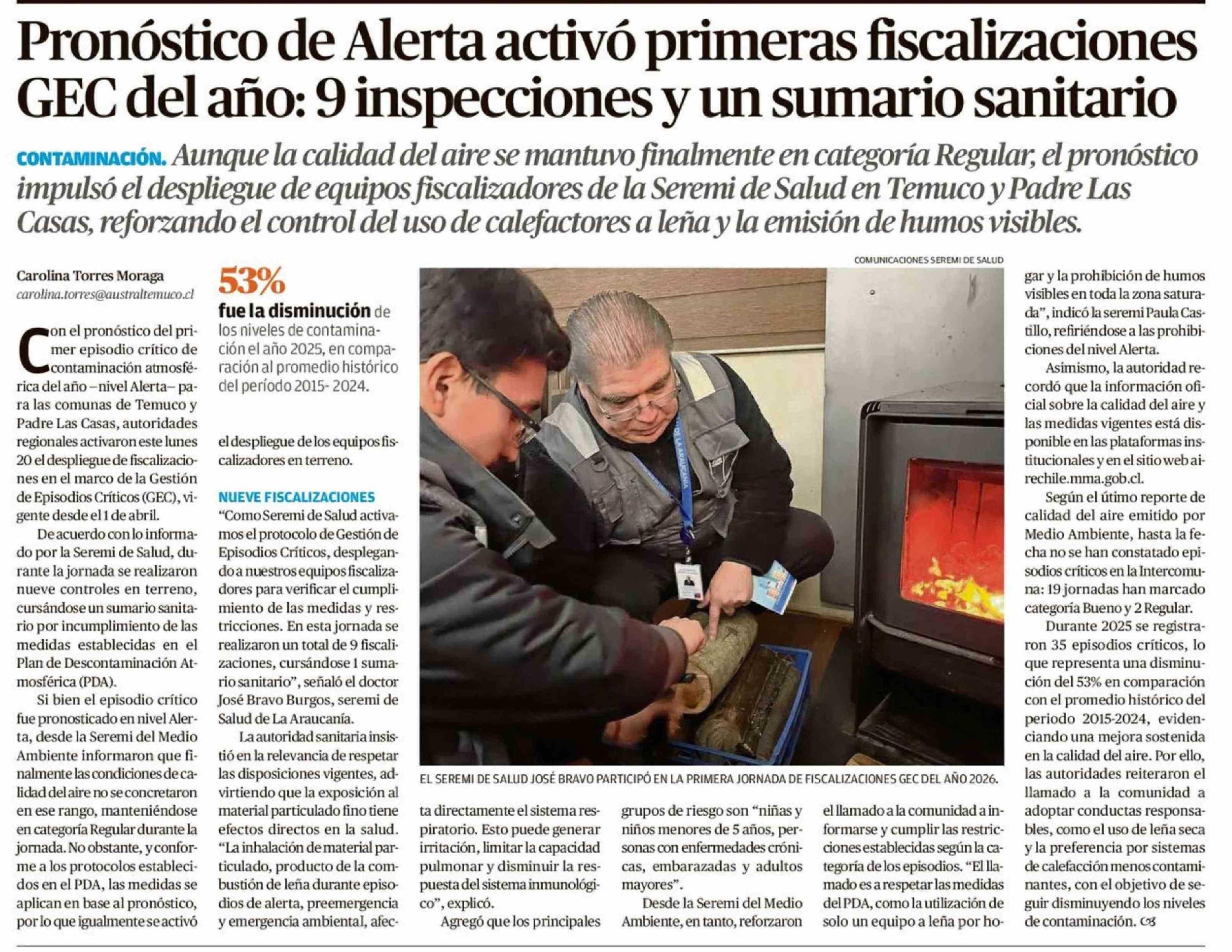 Título: Pronóstico de Alerta activó primeras fiscalizaciones GEC del año: 9 inspecciones y un sumario sanitario