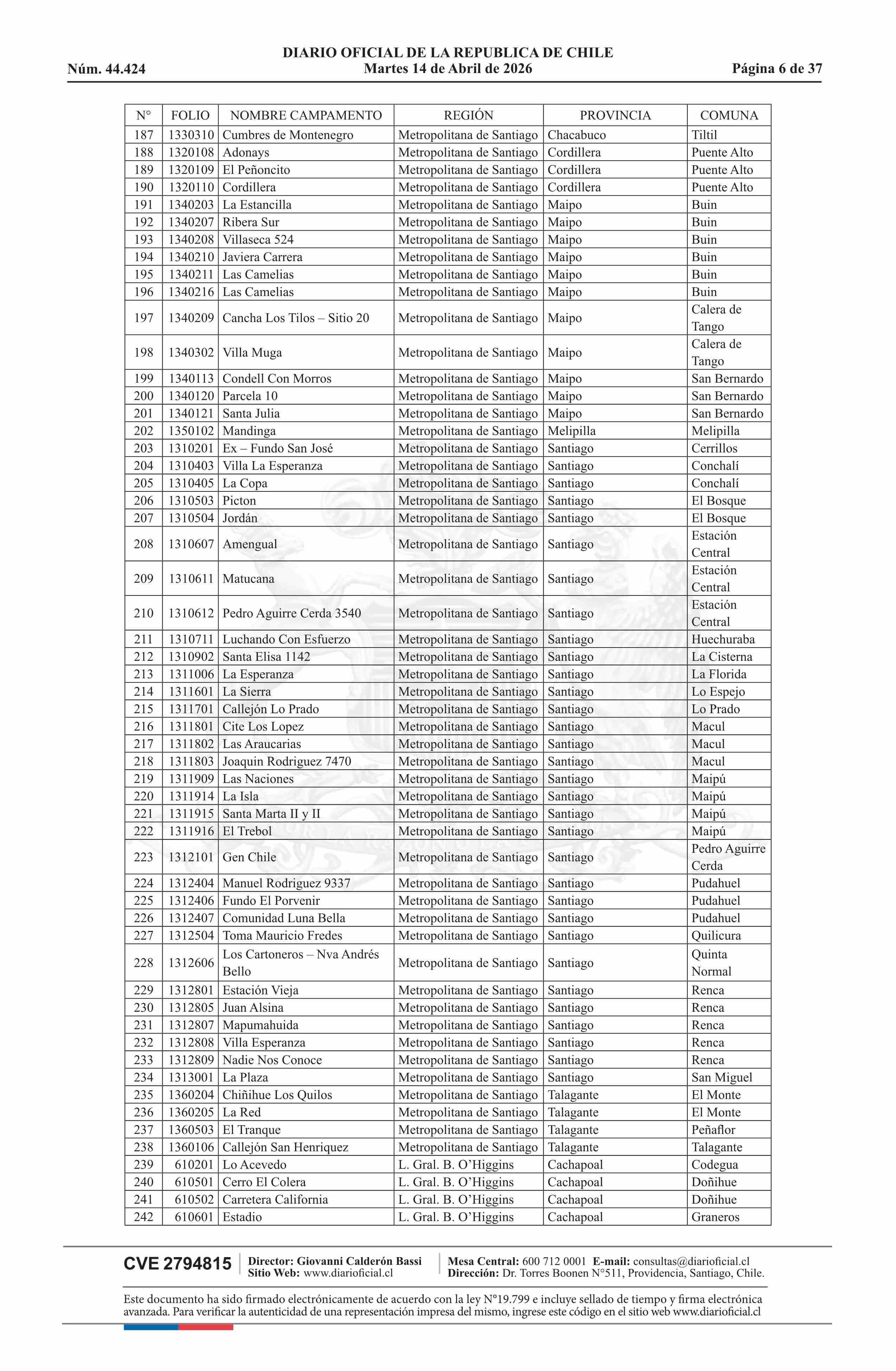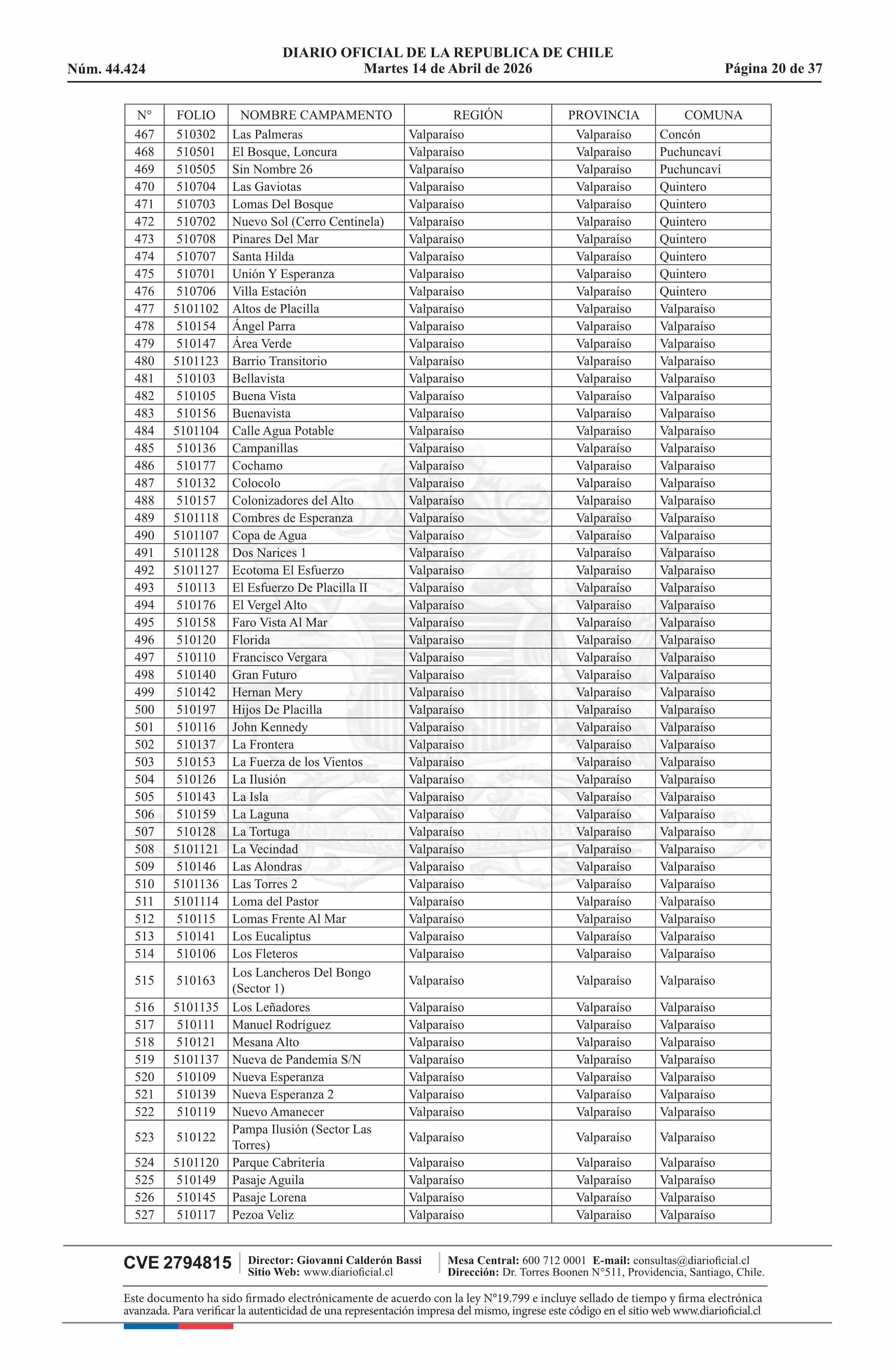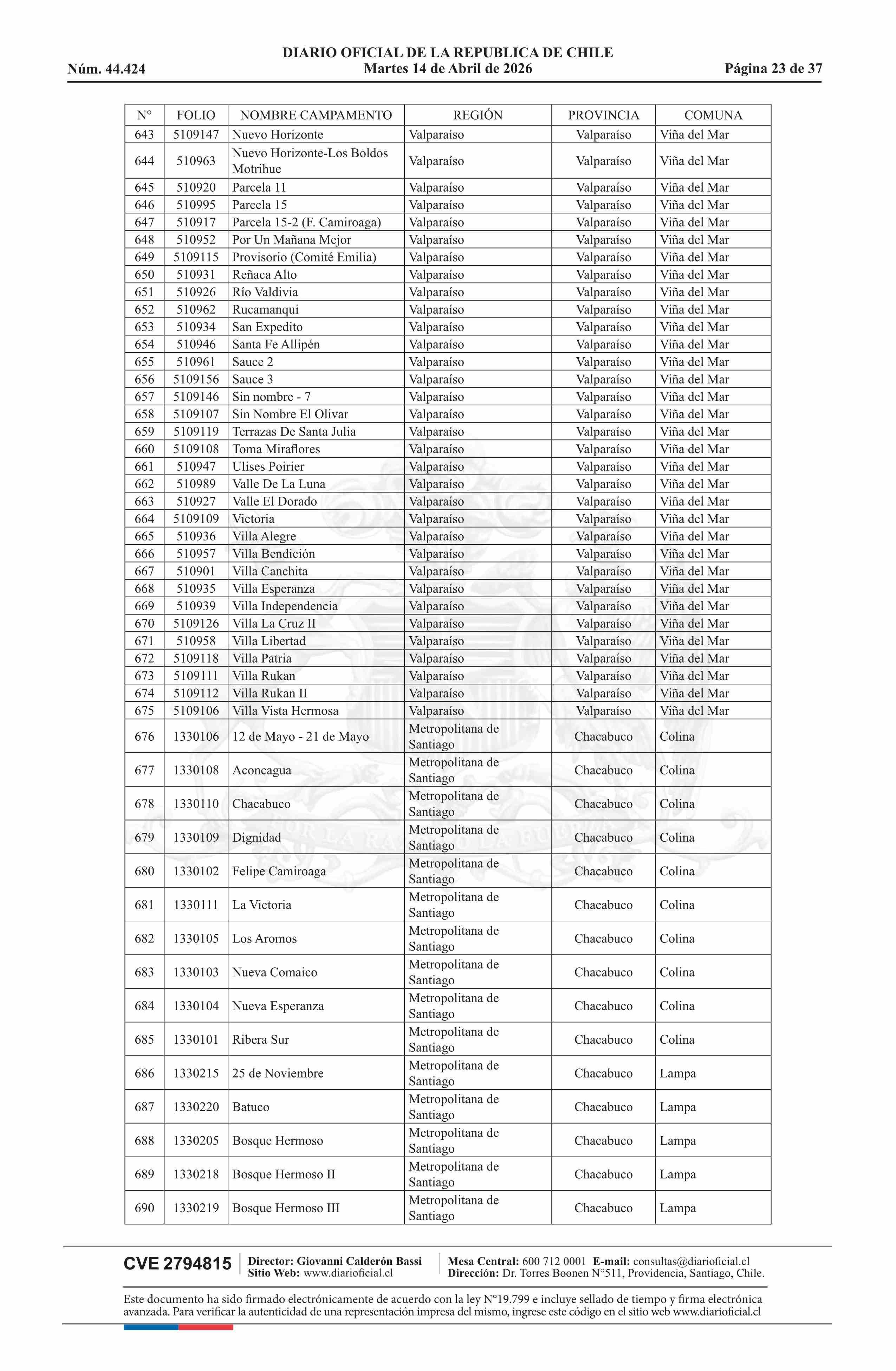 | Título: | Resolución exenta número 377, de 2026.- Aprueba actualización del Registro Histórico de Campamentos y actualización del Registro Vigente de Campamentos, del Catastro de Asentamientos Precarios al 27 de febrero de 2026, y revoca las resoluciones N°s. 335 y 713 exentas, de 2024 |
