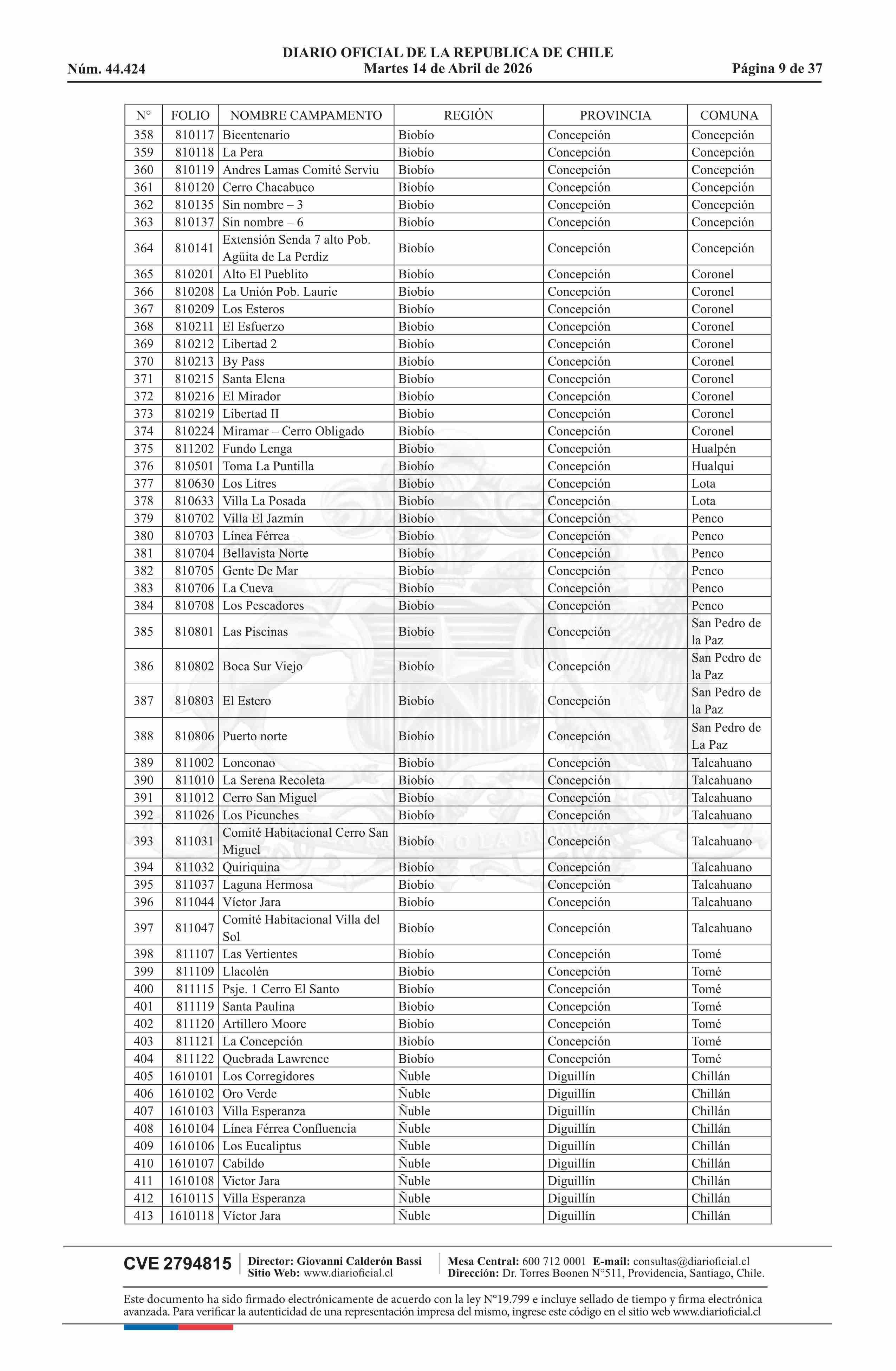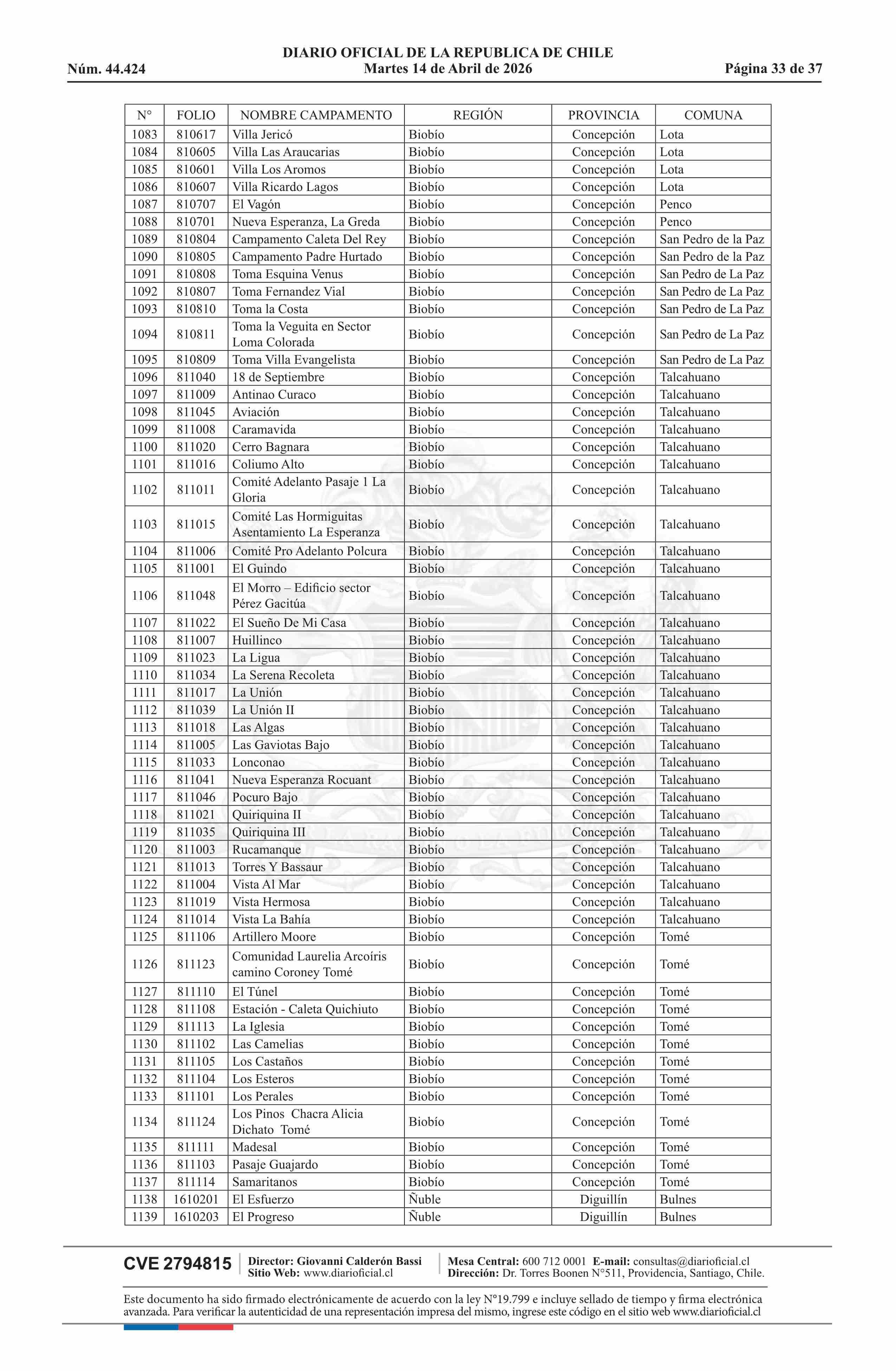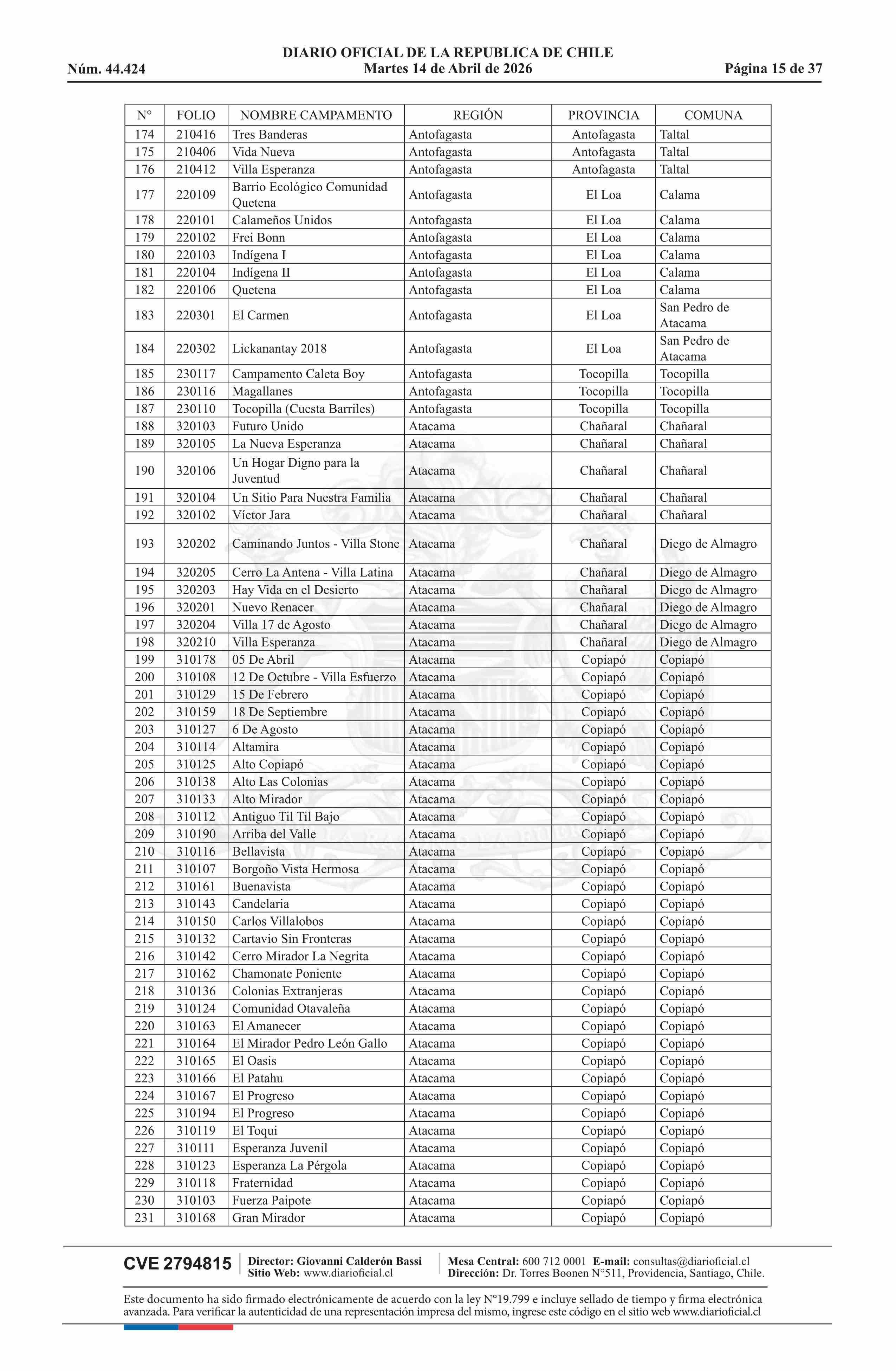 | Título: | Resolución exenta número 377, de 2026.- Aprueba actualización del Registro Histórico de Campamentos y actualización del Registro Vigente de Campamentos, del Catastro de Asentamientos Precarios al 27 de febrero de 2026, y revoca las resoluciones N°s. 335 y 713 exentas, de 2024 |