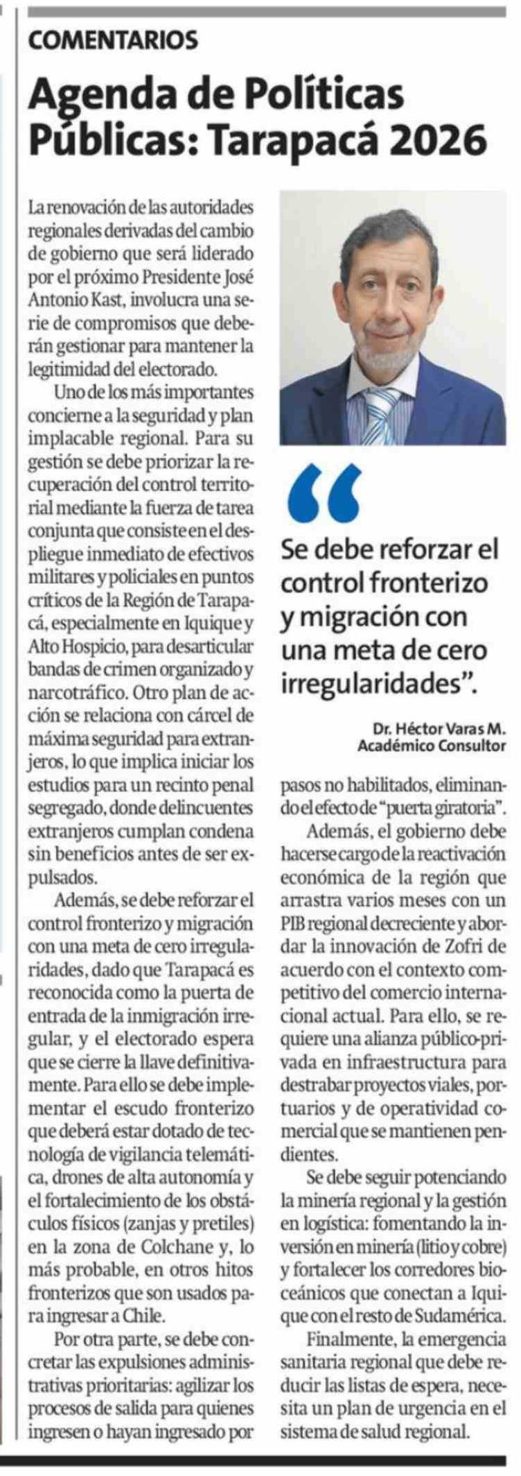 Columnas de Opinión: Agenda de Políticas Públicas: Tarapacá 2026