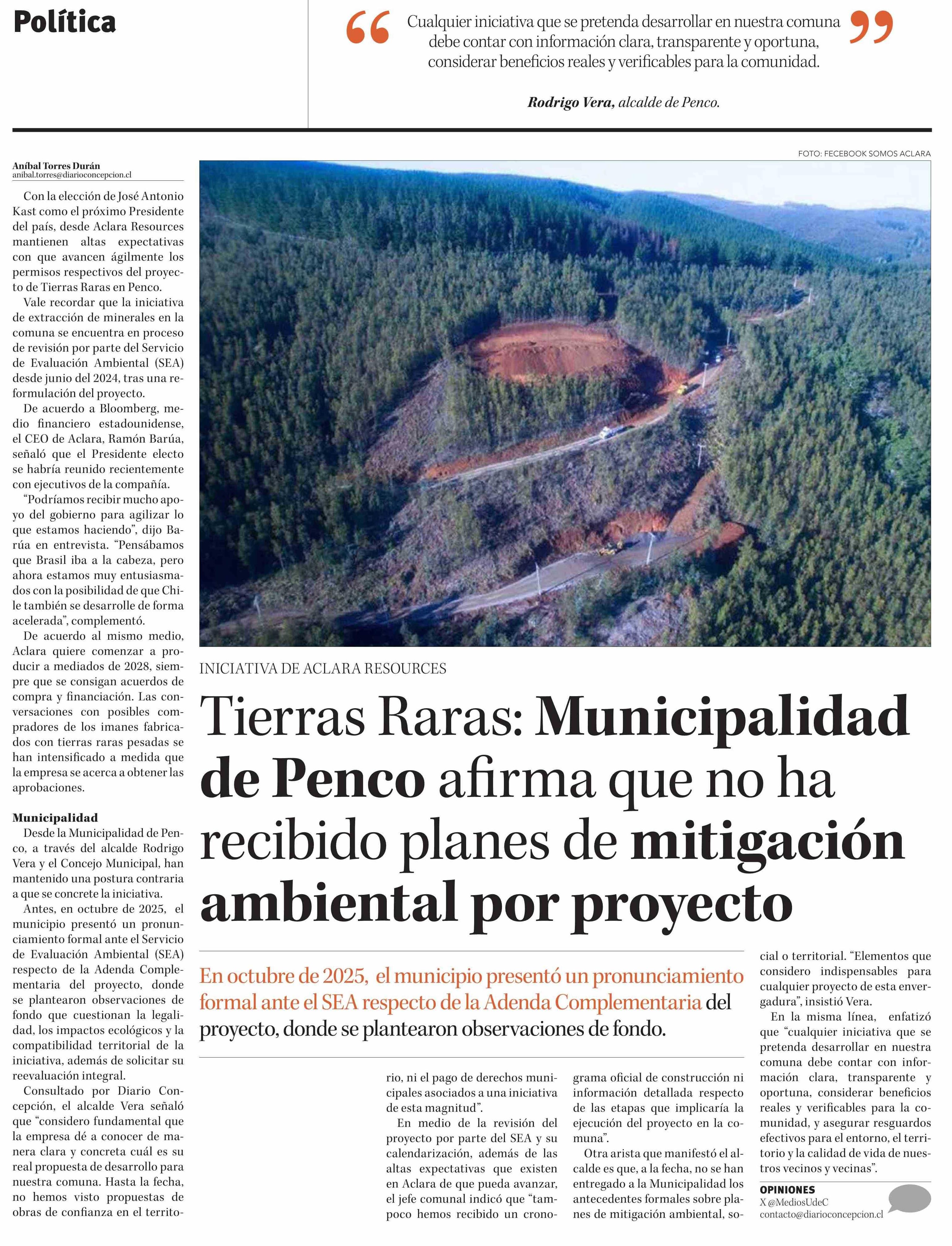 Tierras Raras: Municipalidad de Penco afirma que no ha recibido planes de mitigación ambiental por proyecto