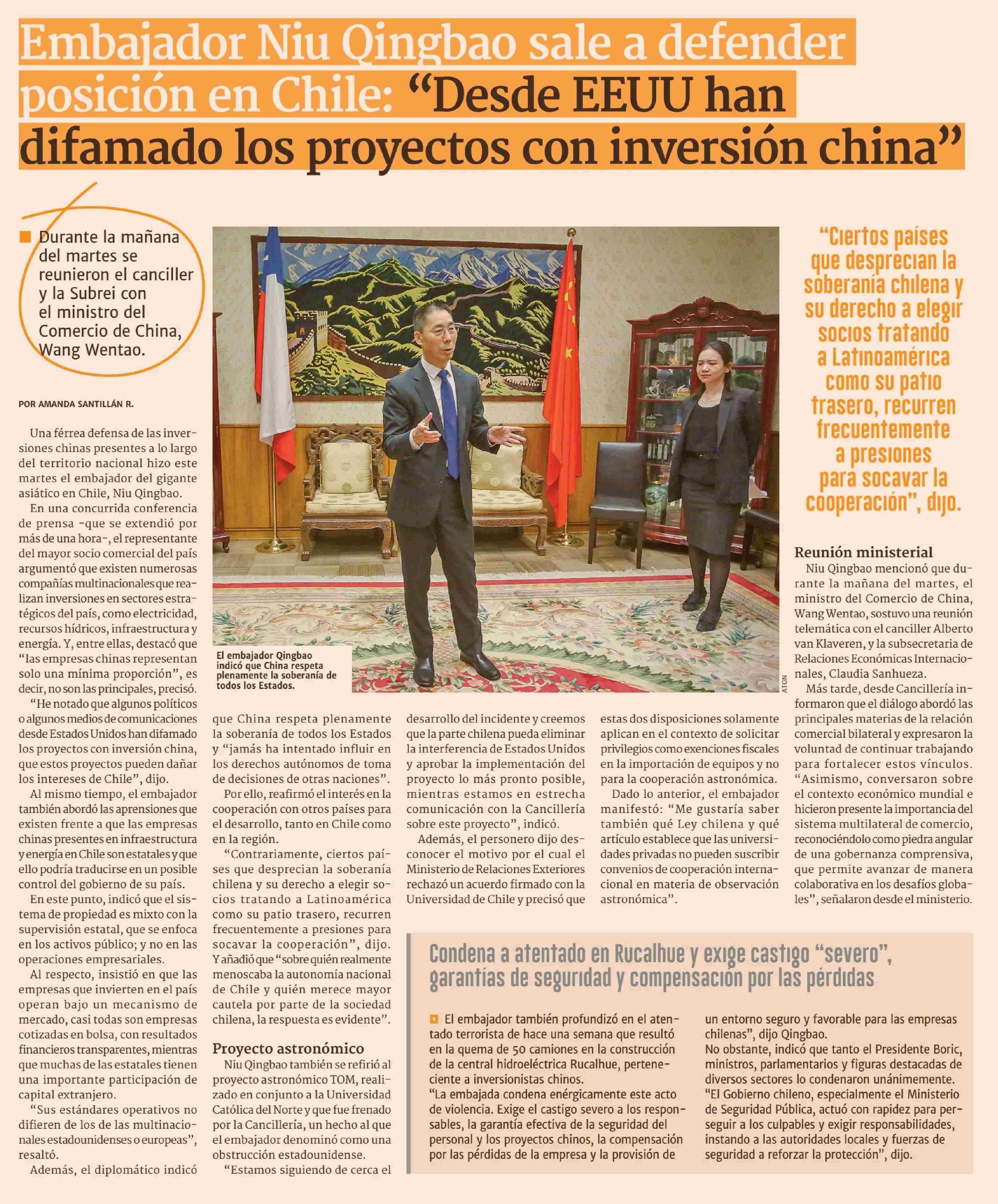 Embajador Niu Qingbao sale a defender posición en Chile:"Desde EEUU han difamado los proyectos con inversión china"