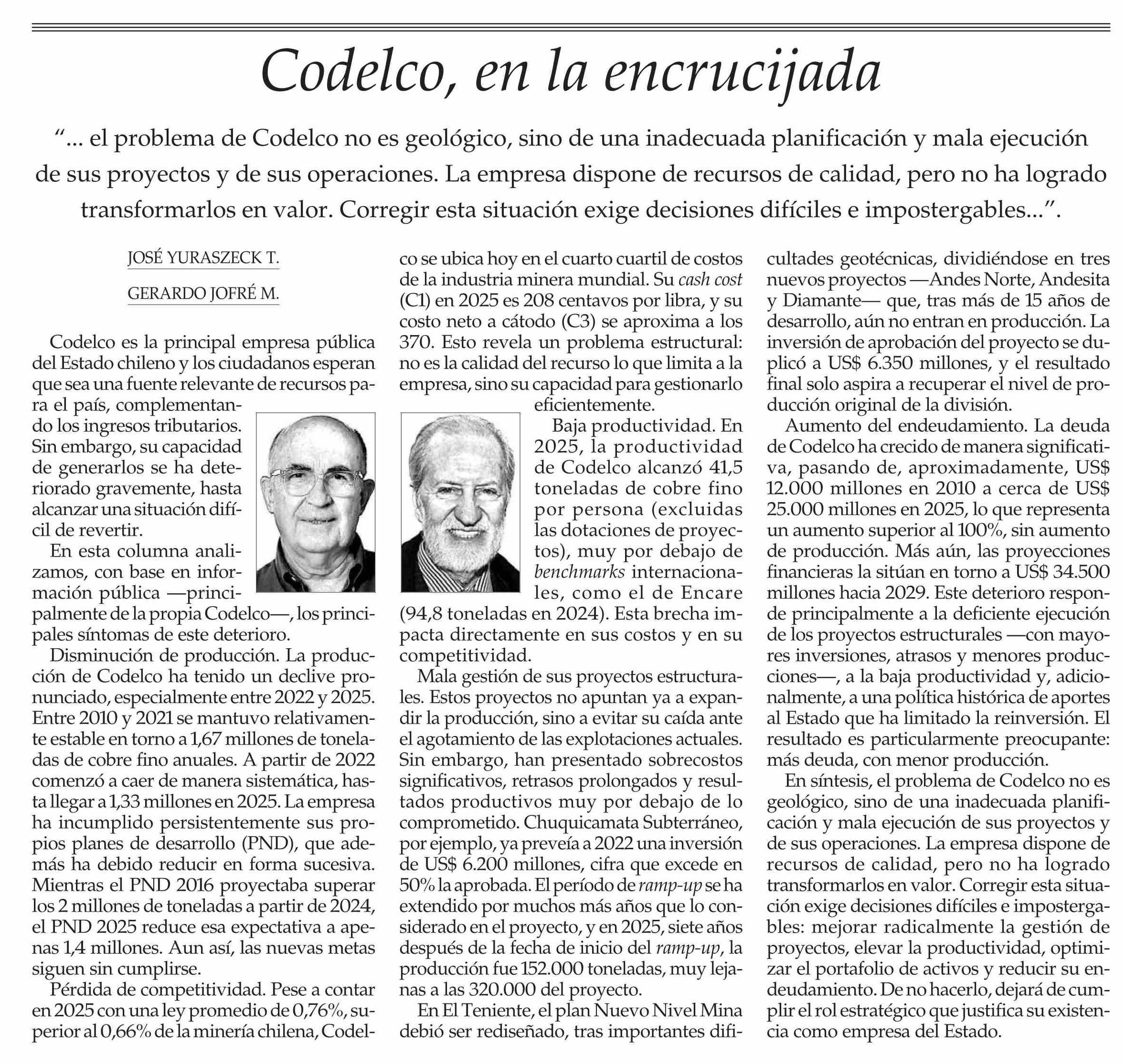 COLUMNAS DE OPINIÓN: Codelco, en la encrucijada