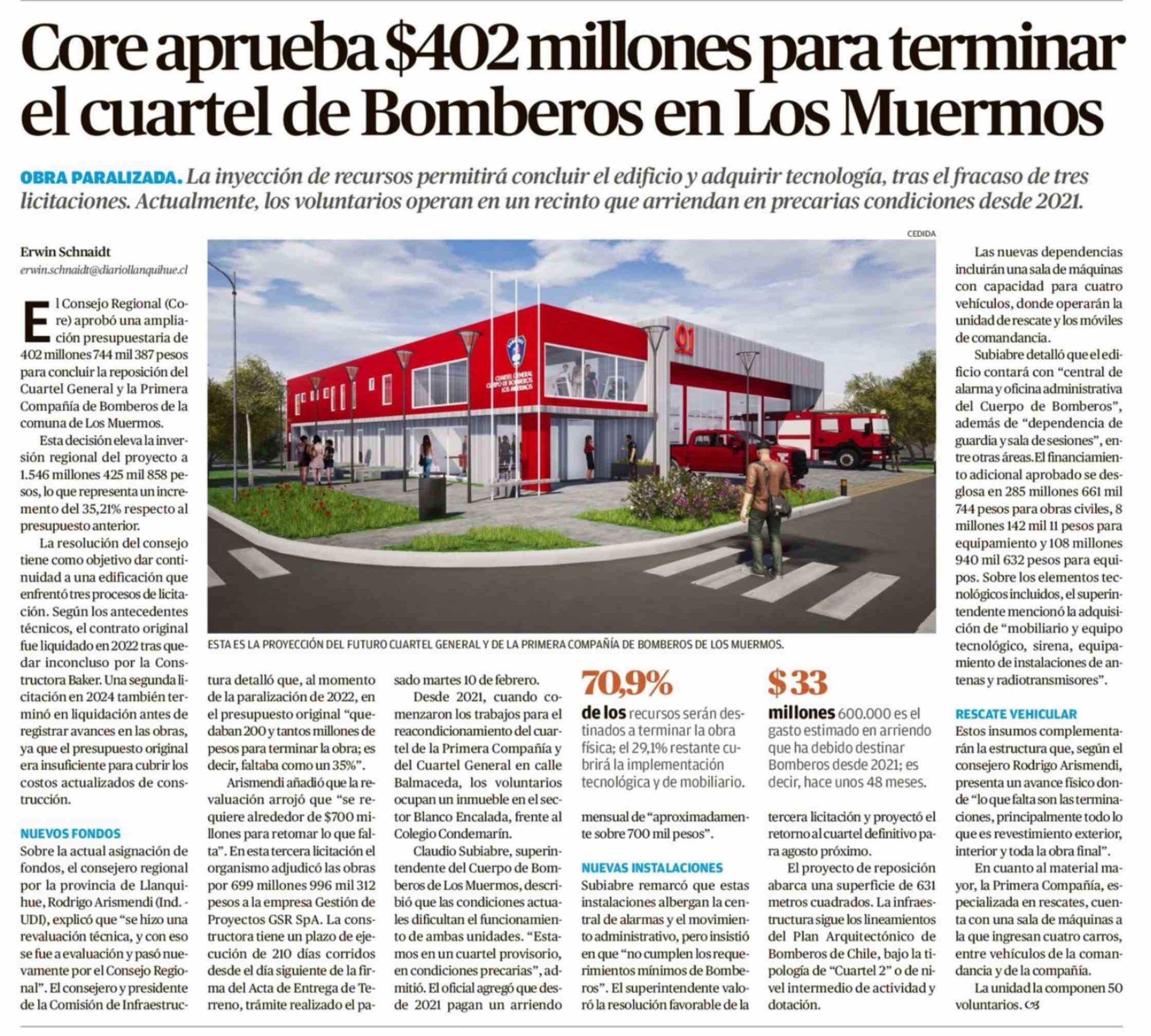 Core aprueba $402 millones para terminar el cuartel de Bomberos en Los Muermos