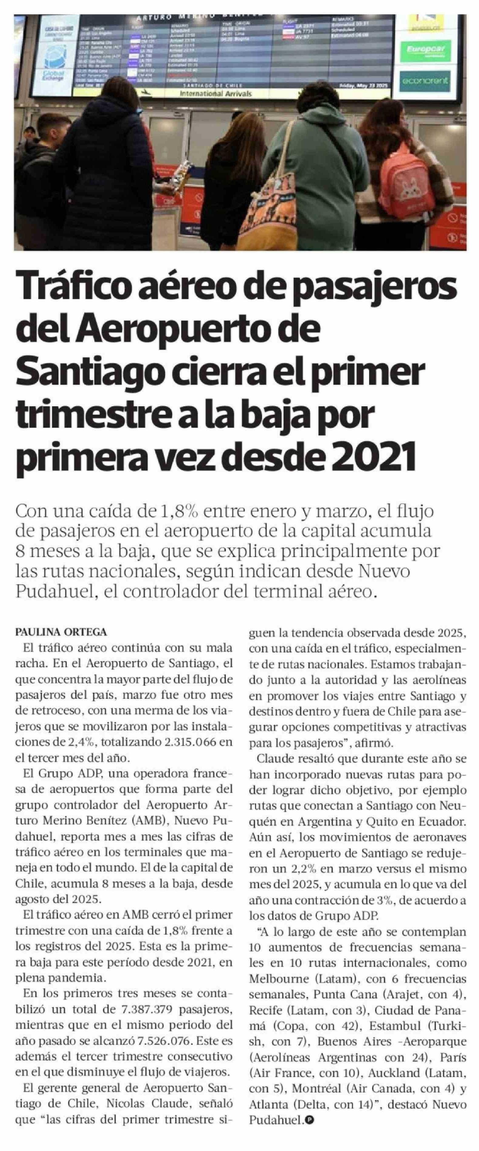 Tráfico aéreo de pasajeros del Aeropuerto de Santiago cierra el primer trimestre a la baja por primera vez desde 2021