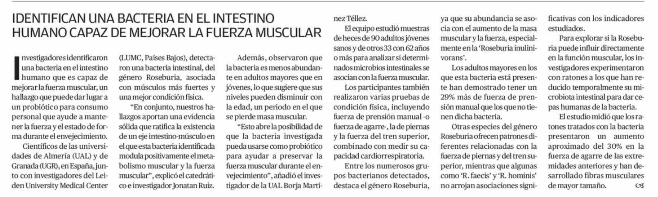 IDENTIFICAN UNA BACTERIA EN EL INTESTINO HUMANO CAPAZ DE MEJORAR LA FUERZA MUSCULAR
