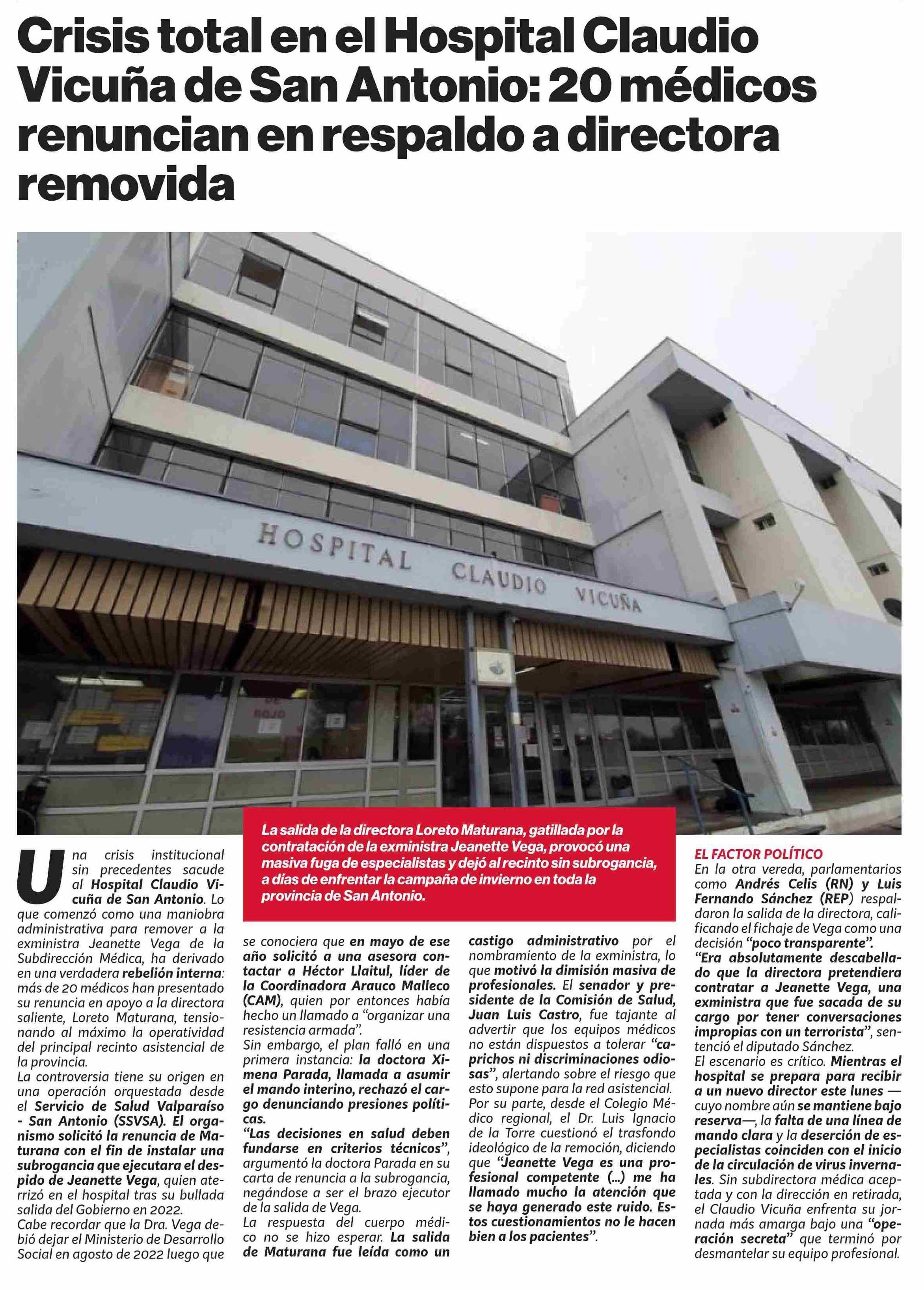 Crisis total en el Hospital Claudio Vicuña de San Antonio: 20 médicos renuncian en respaldo a directora removida
