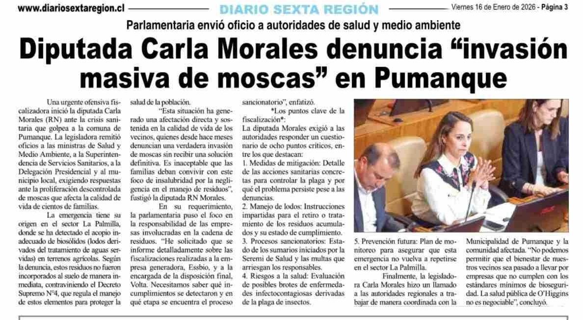 Título: Diputada Carla Morales denuncia "invasión masiva de moscas" en Pumanque