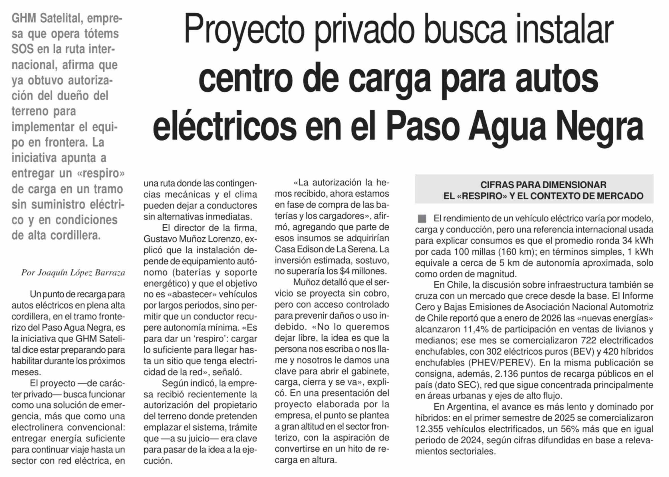 Proyecto privado busca instalar centro de carga para autos eléctricos en el Paso Agua Negra