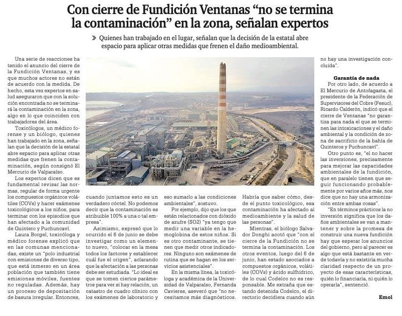 Con cierre de Fundición Ventanas "no se termina la contaminación" en la zona, señalan expertos