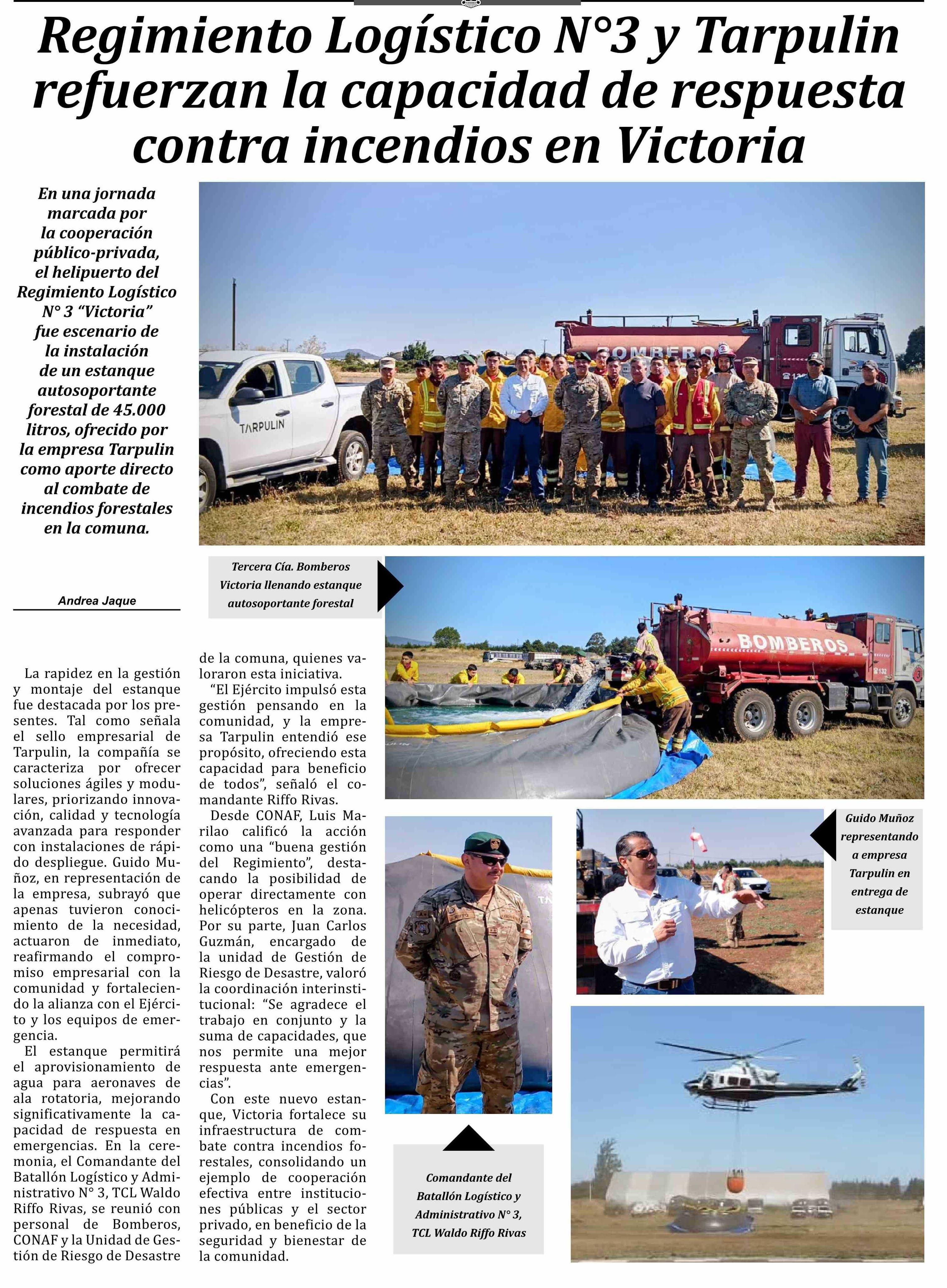 Regimiento Logístico Nº3 y Tarpulin refuerzan la capacidad de respuesta contra incendios en Victoria