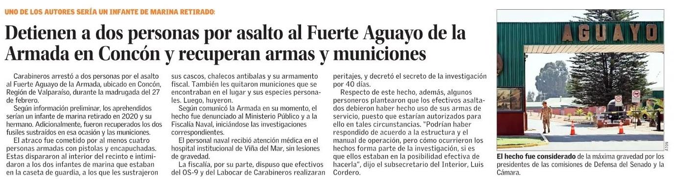 Detienen a dos personas por asalto al Fuerte Aguayo de la Armada en Concón y recuperan armas y municiones
