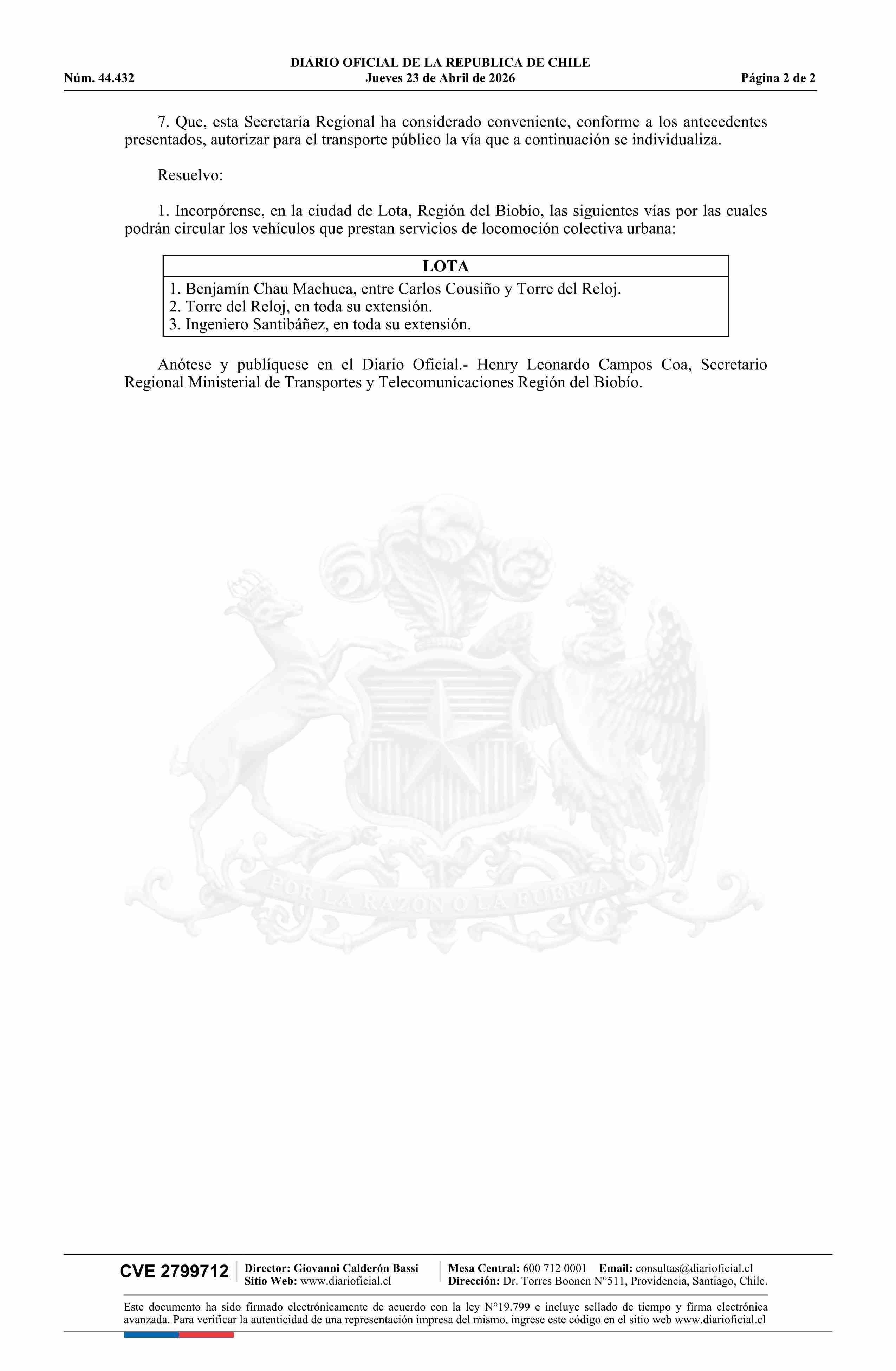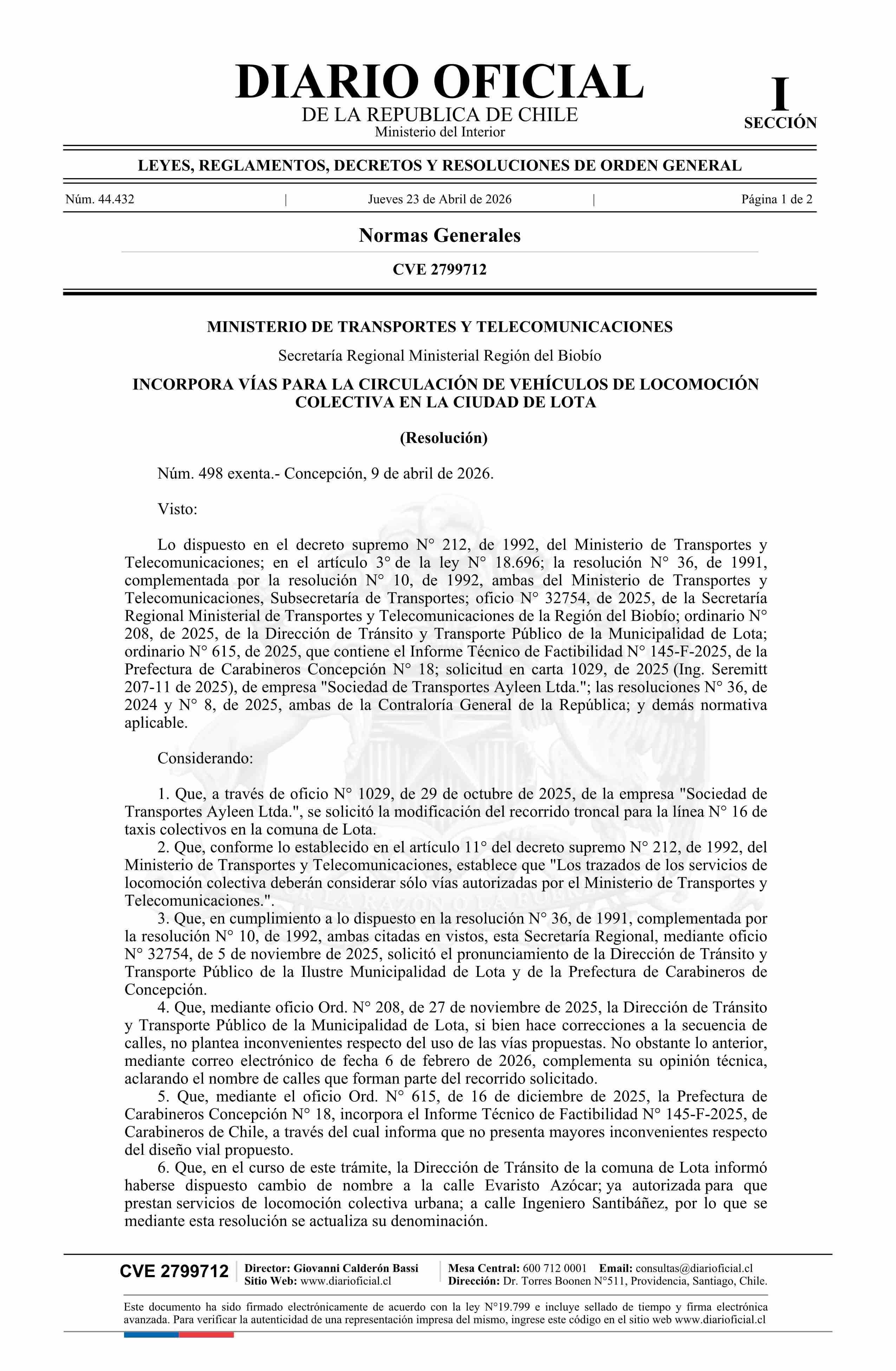 | Título: | Resolución exenta número 498, de 2026.- Incorpora vías para la circulación de vehículos de locomoción colectiva en la ciudad de Lota |