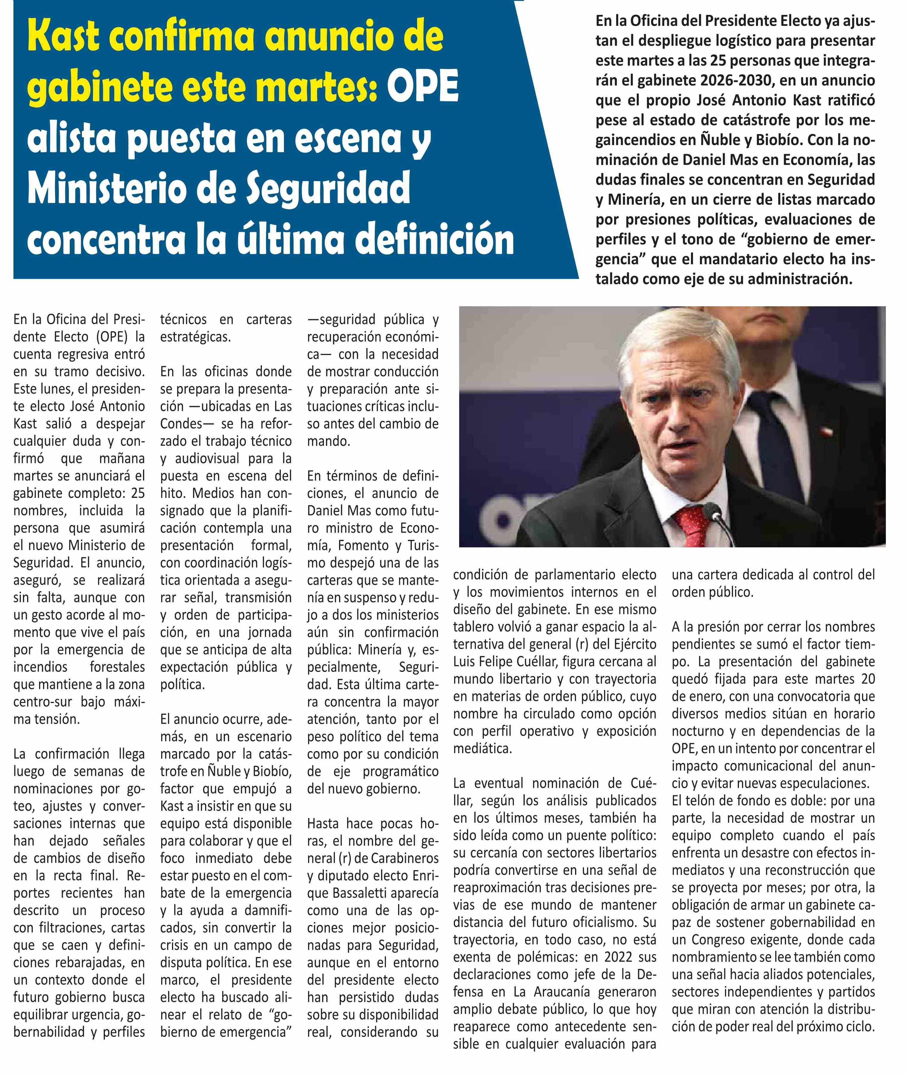 Kast confirma anuncio de gabinete este martes: OPE alista puesta en escena y Ministerio de Seguridad concentra la última definición