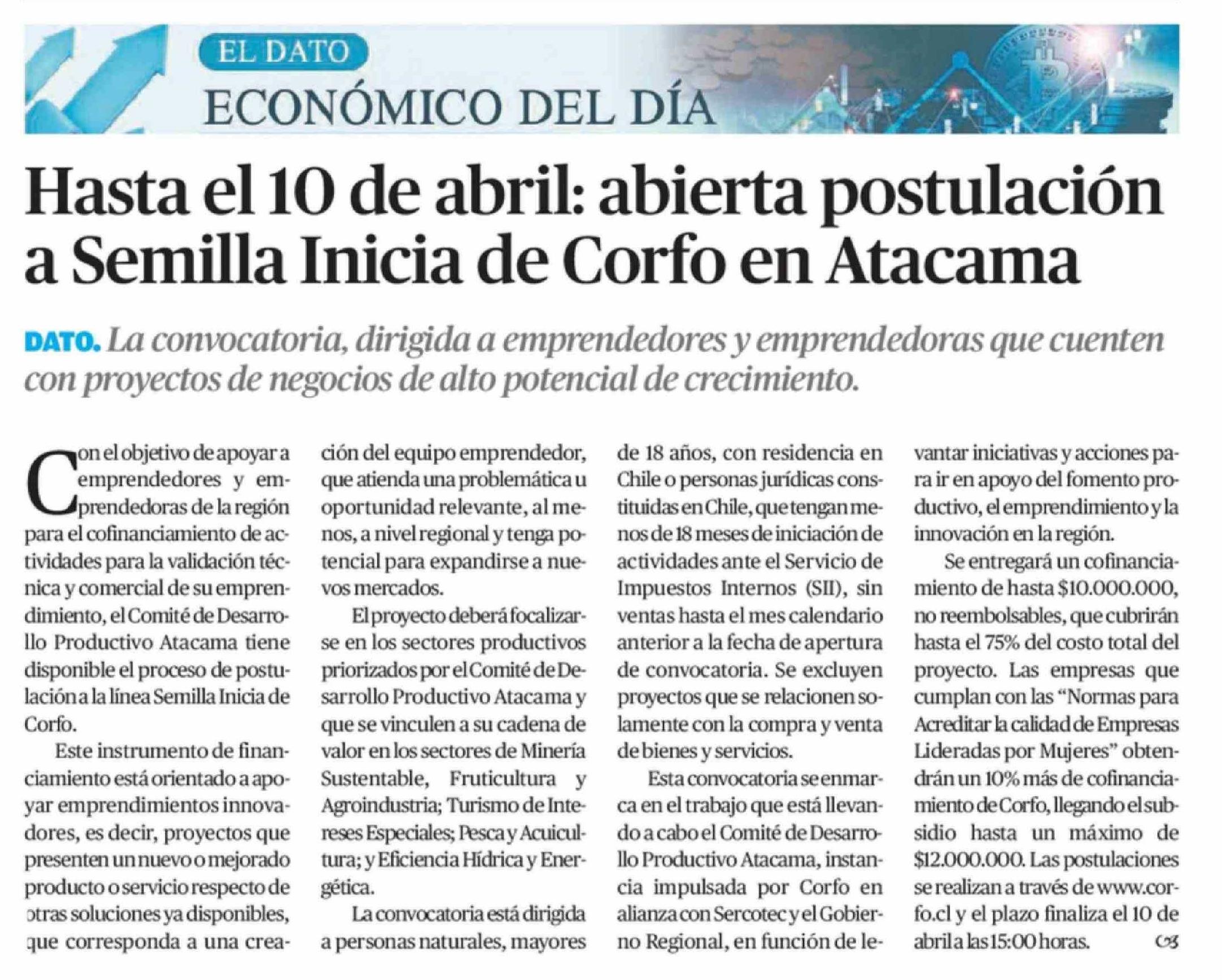 Hasta el 10 de abril: abierta postulación a Semilla Inicia de Corfo en Atacama
