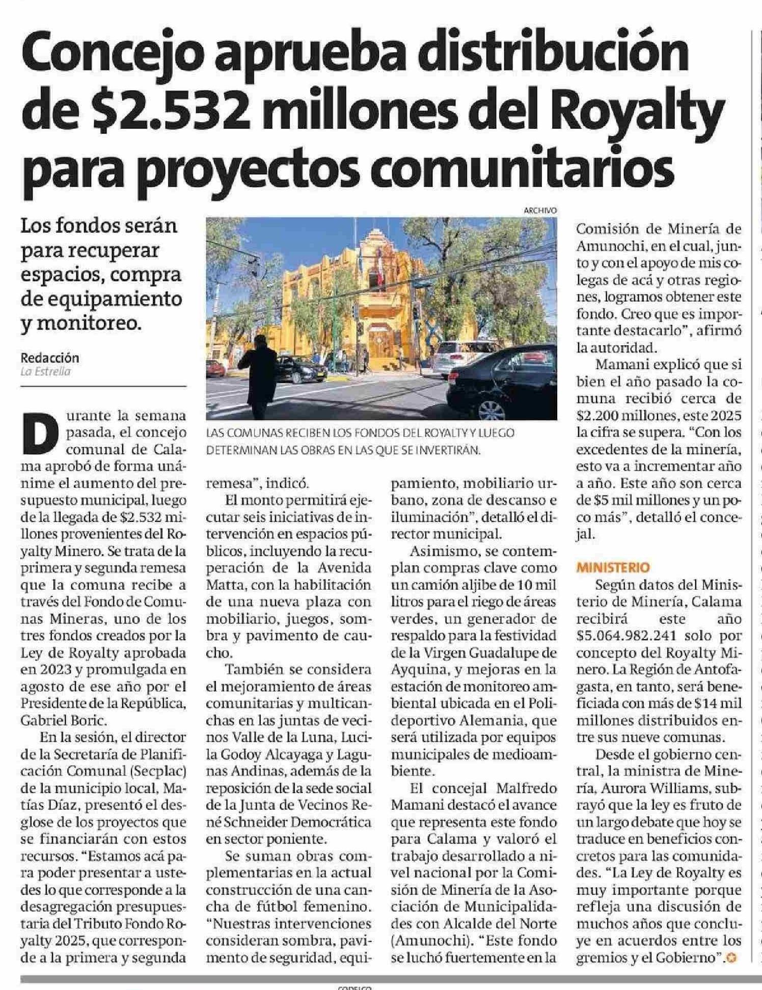 Concejo aprueba distribución de $2.532 millones del Royalty para proyectos comunitarios