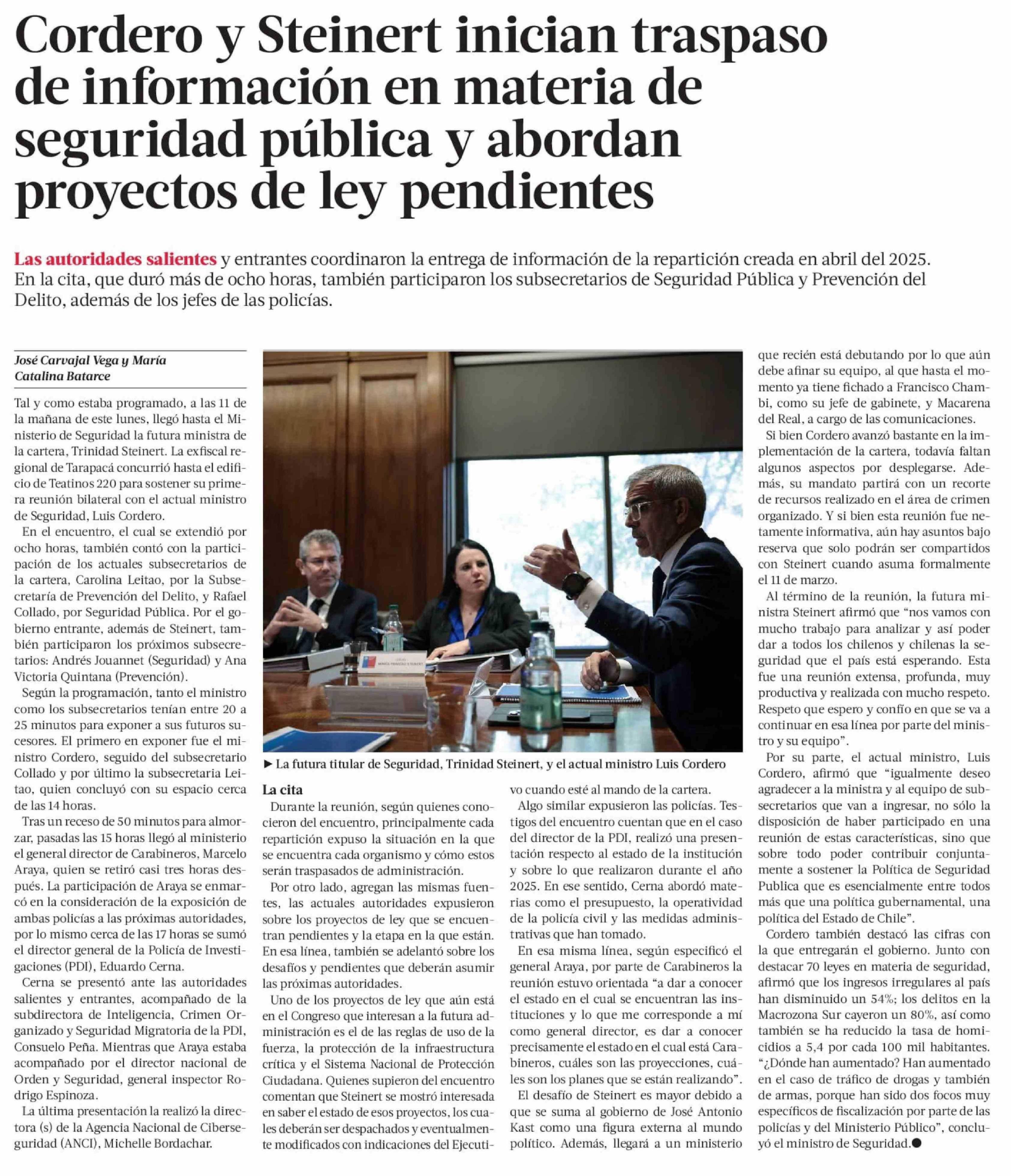 Cordero y Steinert inician traspaso de información en materia de seguridad pública y abordan proyectos de ley pendientes