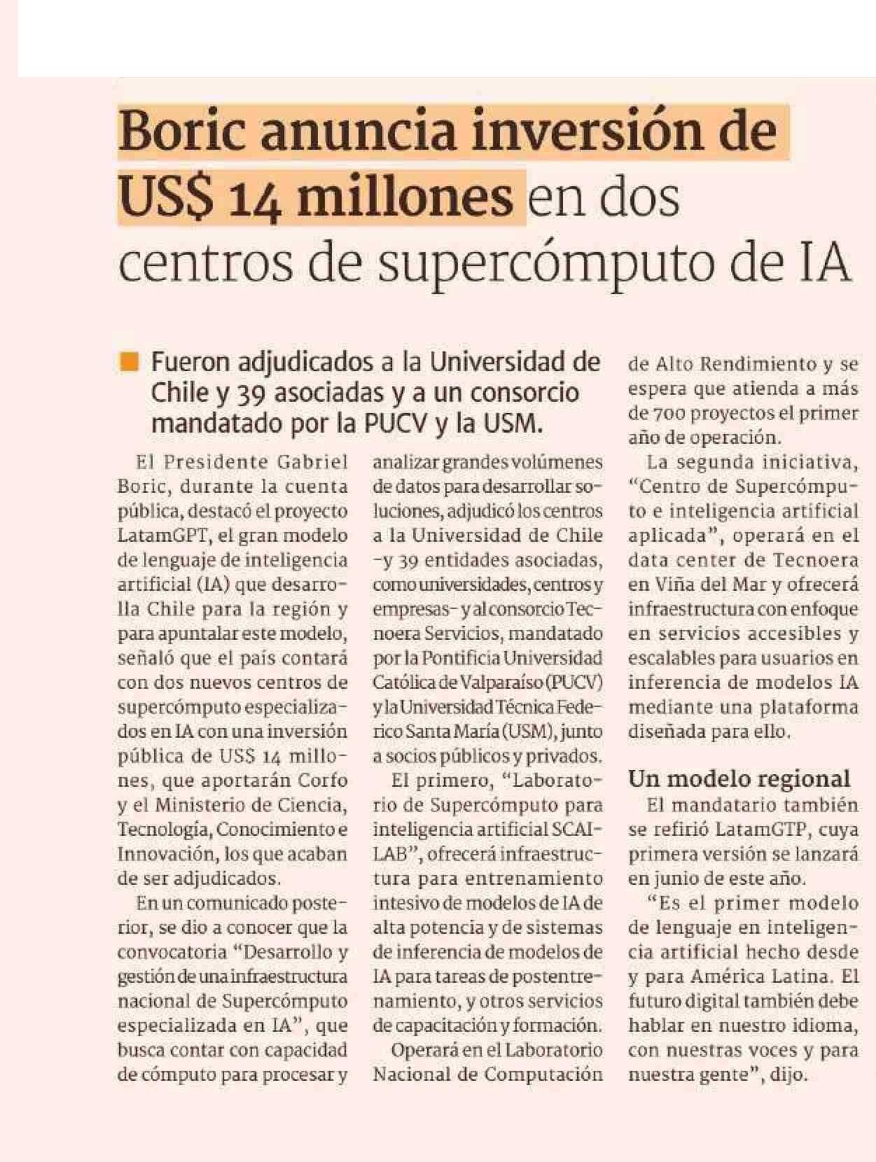 Boric anuncia inversión de USS 14 millones en dos centros de supercómputo de IA