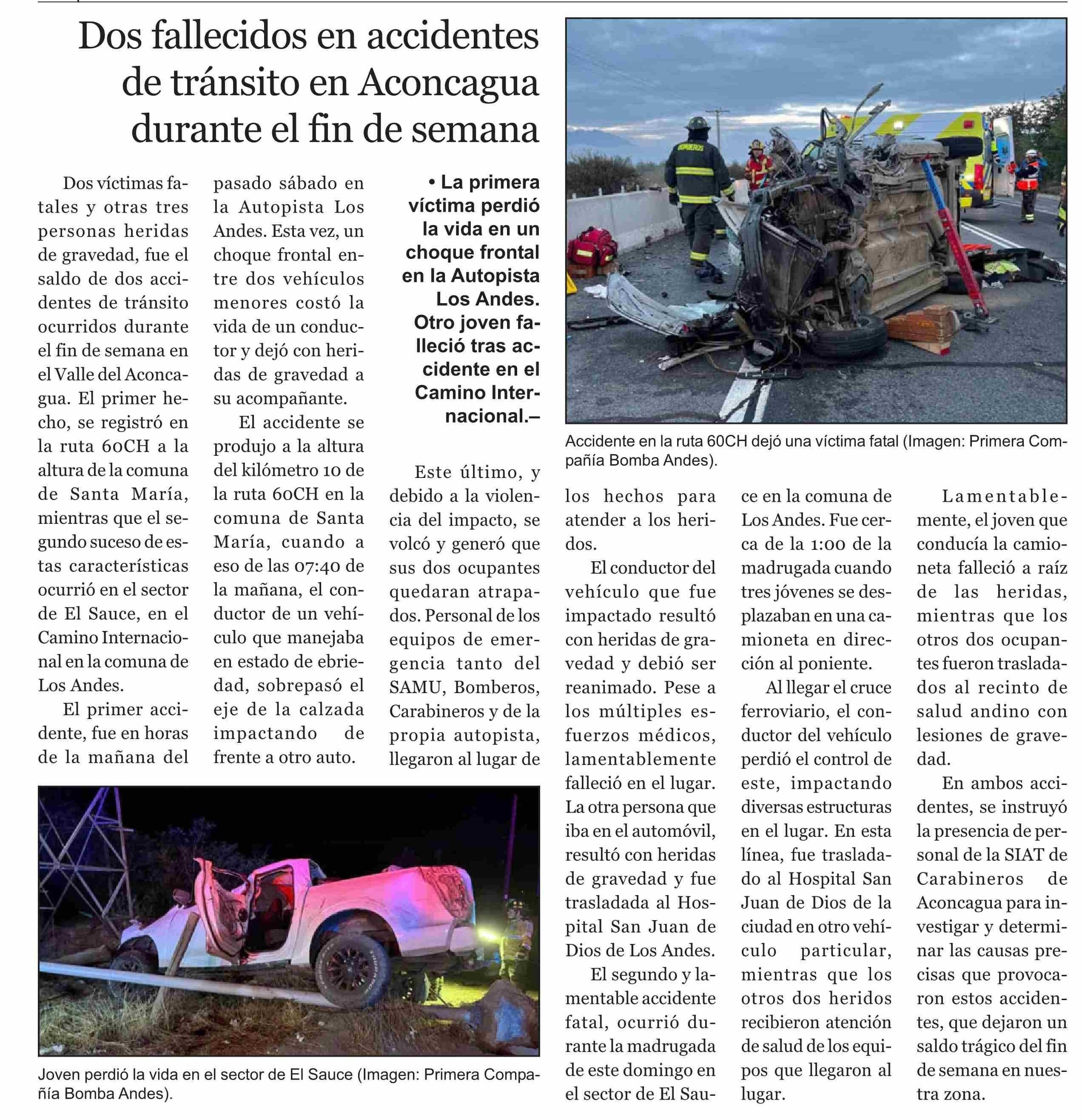Dos fallecidos en accidentes de tránsito en Aconcagua durante el fin de semana