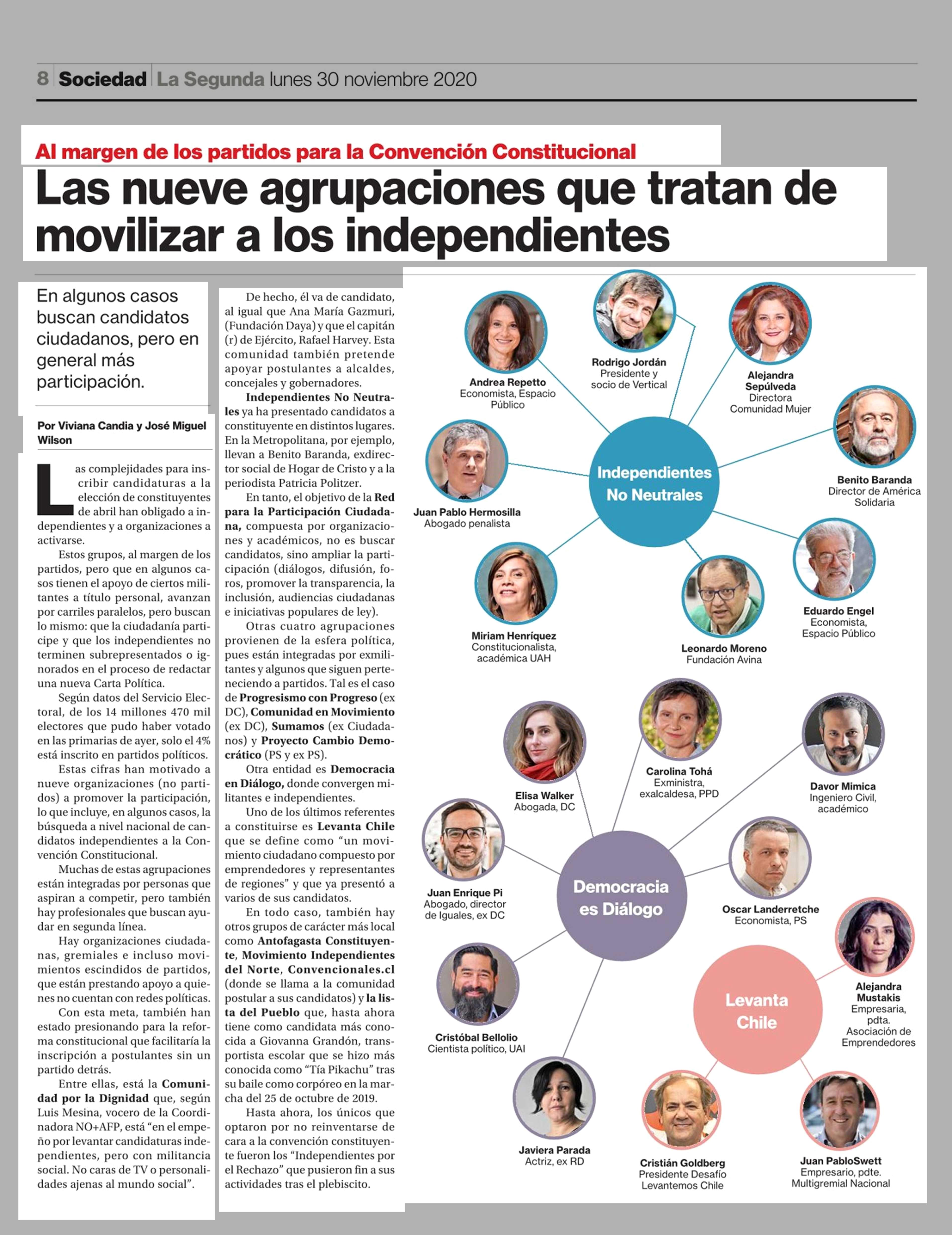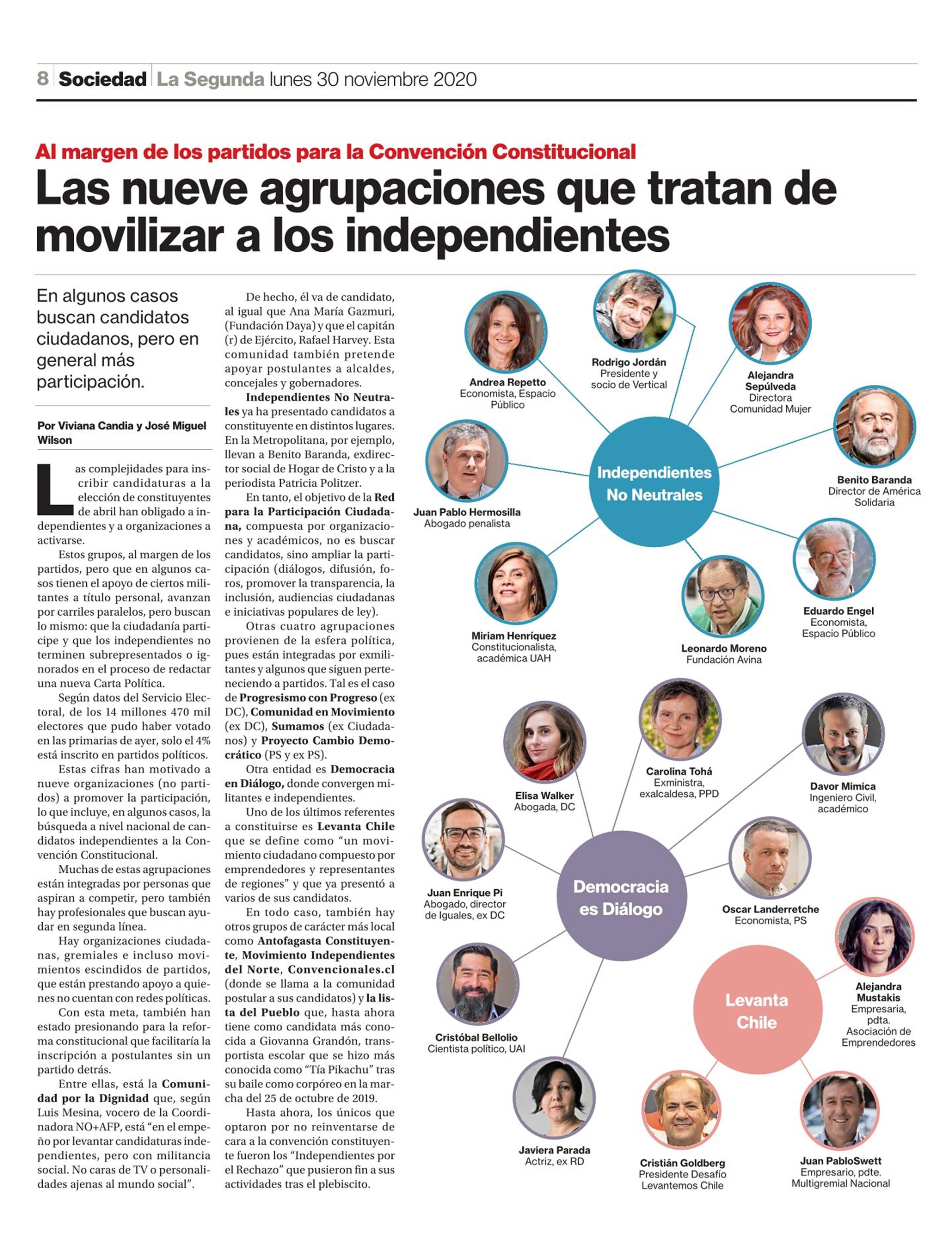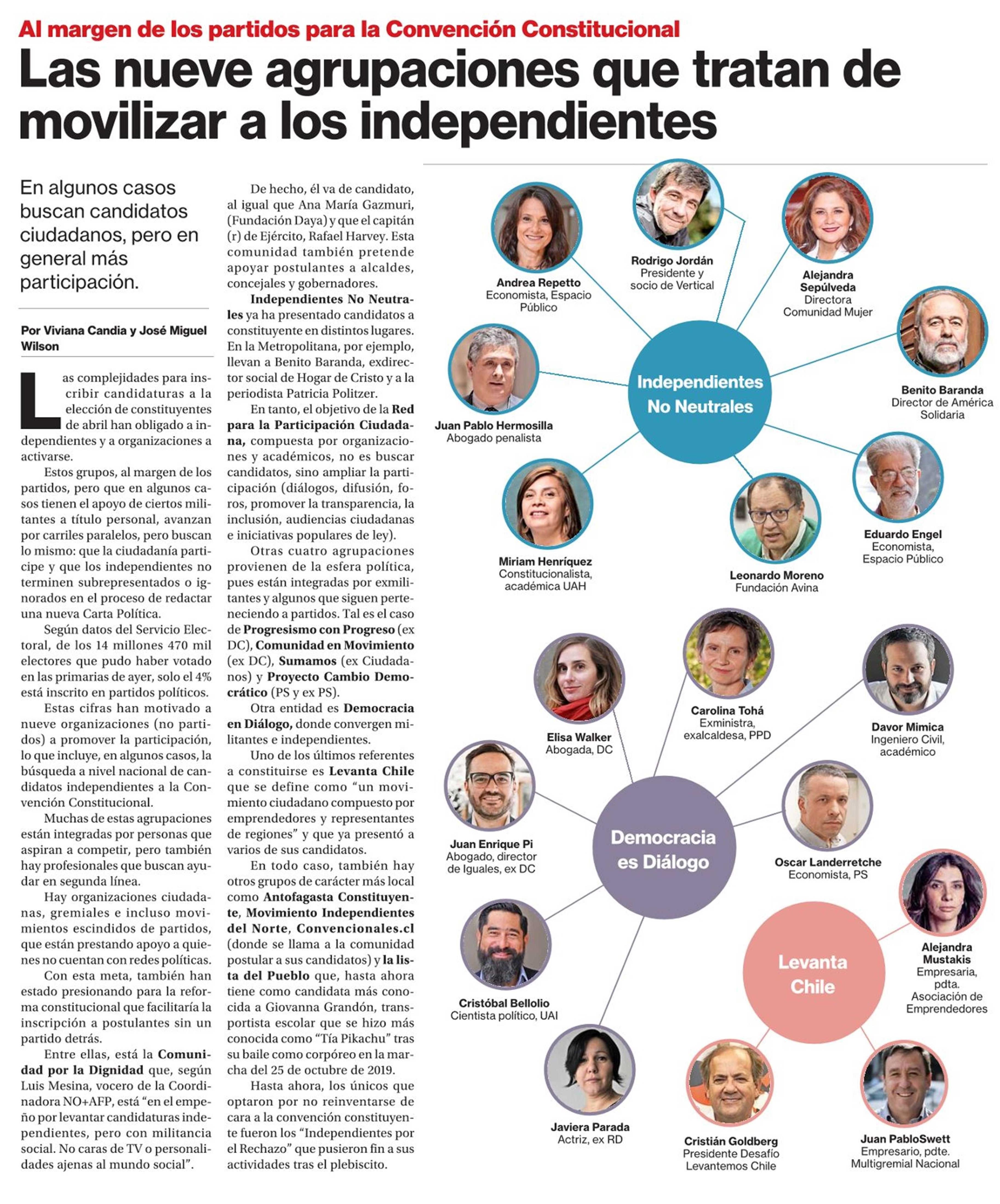 Las nueve agrupaciones que tratan de movilizar a los independientes 30/11/2020 La Segunda Al margen de los partidos para la Convención Constitucional Las nueve agrupaciones que tratan de movilizar a los independientes En algunos casos buscan candidatos ciudadanos, pero ... |