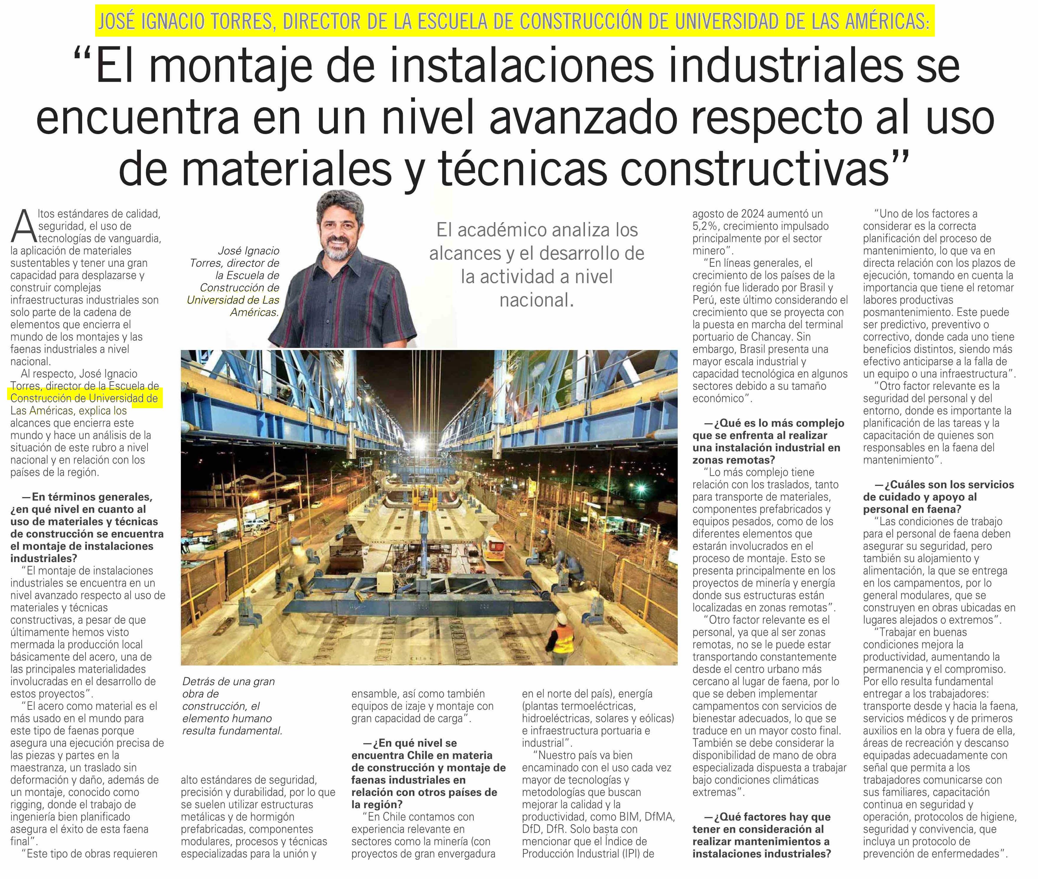 “El montaje de instalaciones industriales se encuentra en un nivel avanzado respecto al uso de materiales y técnicas constructivas”