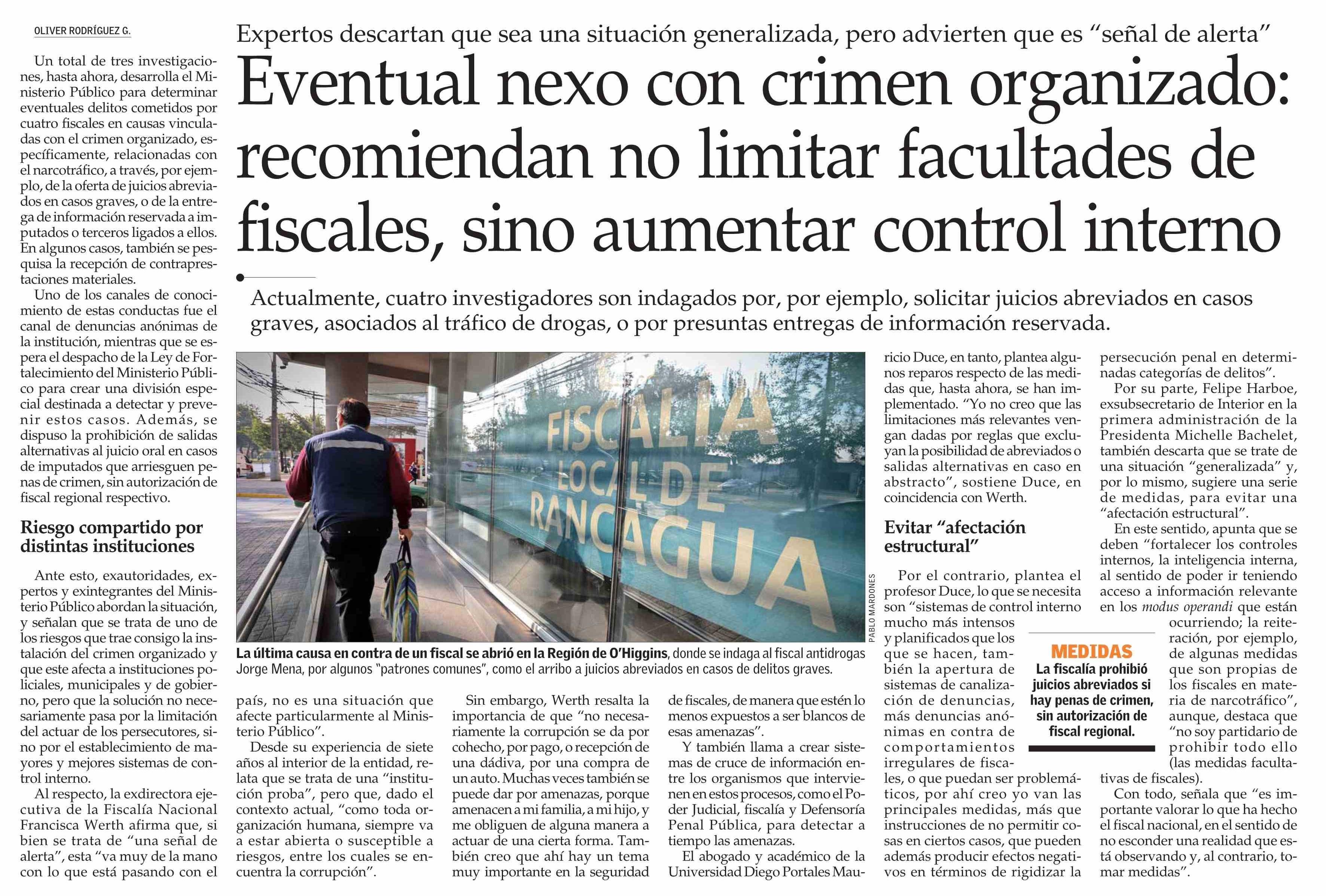 Eventual nexo con crimen organizado: recomiendan no limitar facultades de fiscales, sino aumentar control interno