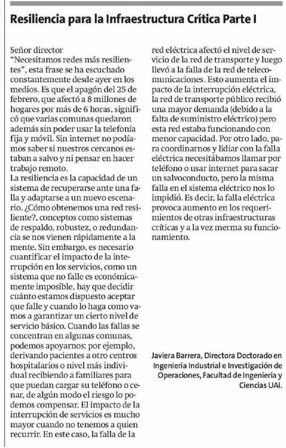 Señor director *Necesitamos redes más resilientes”, esta frase se ha escuchado constantemente desde ayer en los medios. Es que el apagón del 25 de febrero, que afectó a 8 millones de hogares por más de 6 horas, significó que varias comunas quedaron además sin poder usar la telefonía fija y móvil. Si