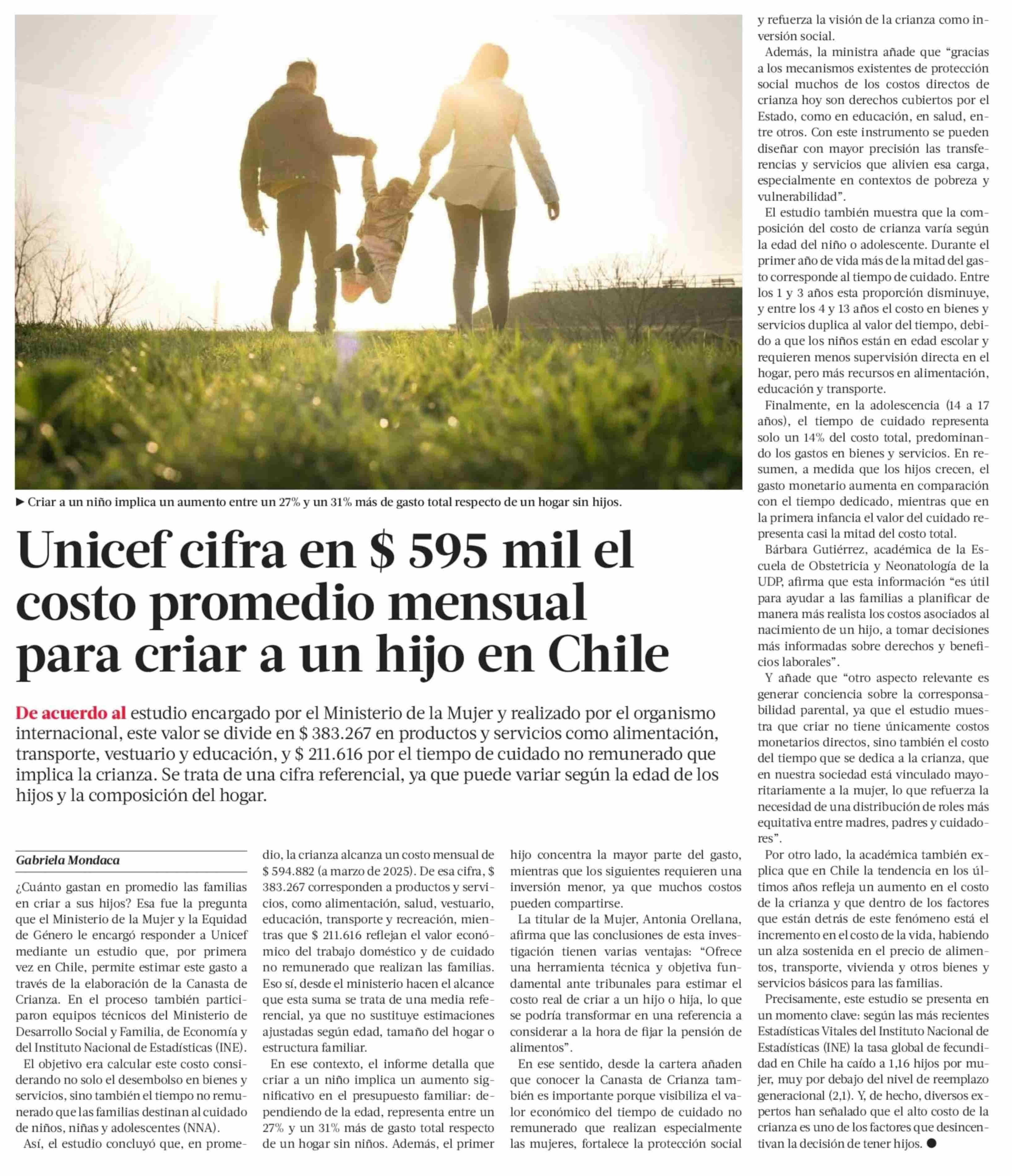 Unicef cifra en $ 595 mil el costo promedio mensual para criar a un hijo en Chile