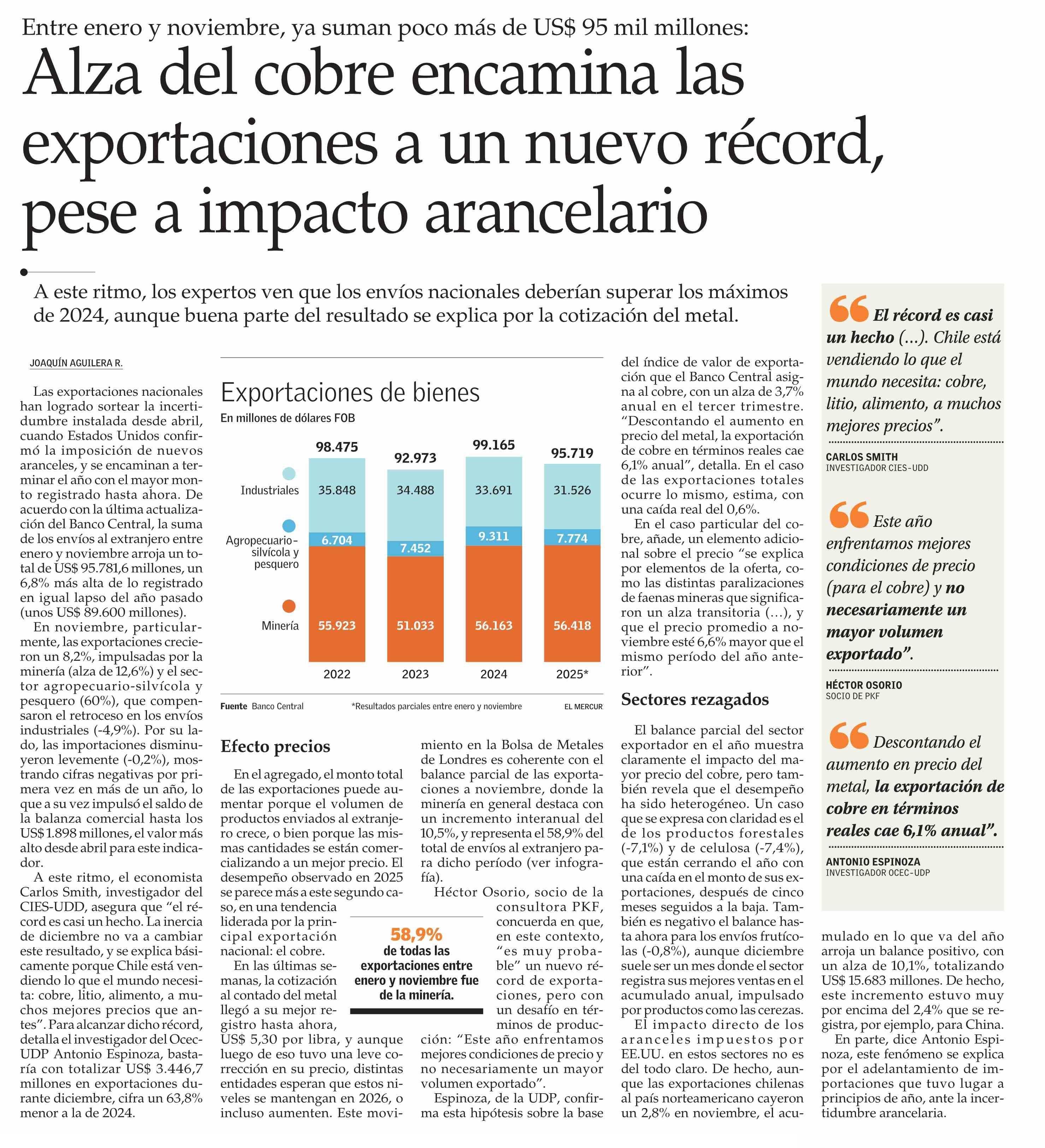 Alza del cobre encamina las exportaciones a un nuevo récord, pese a impacto arancelario