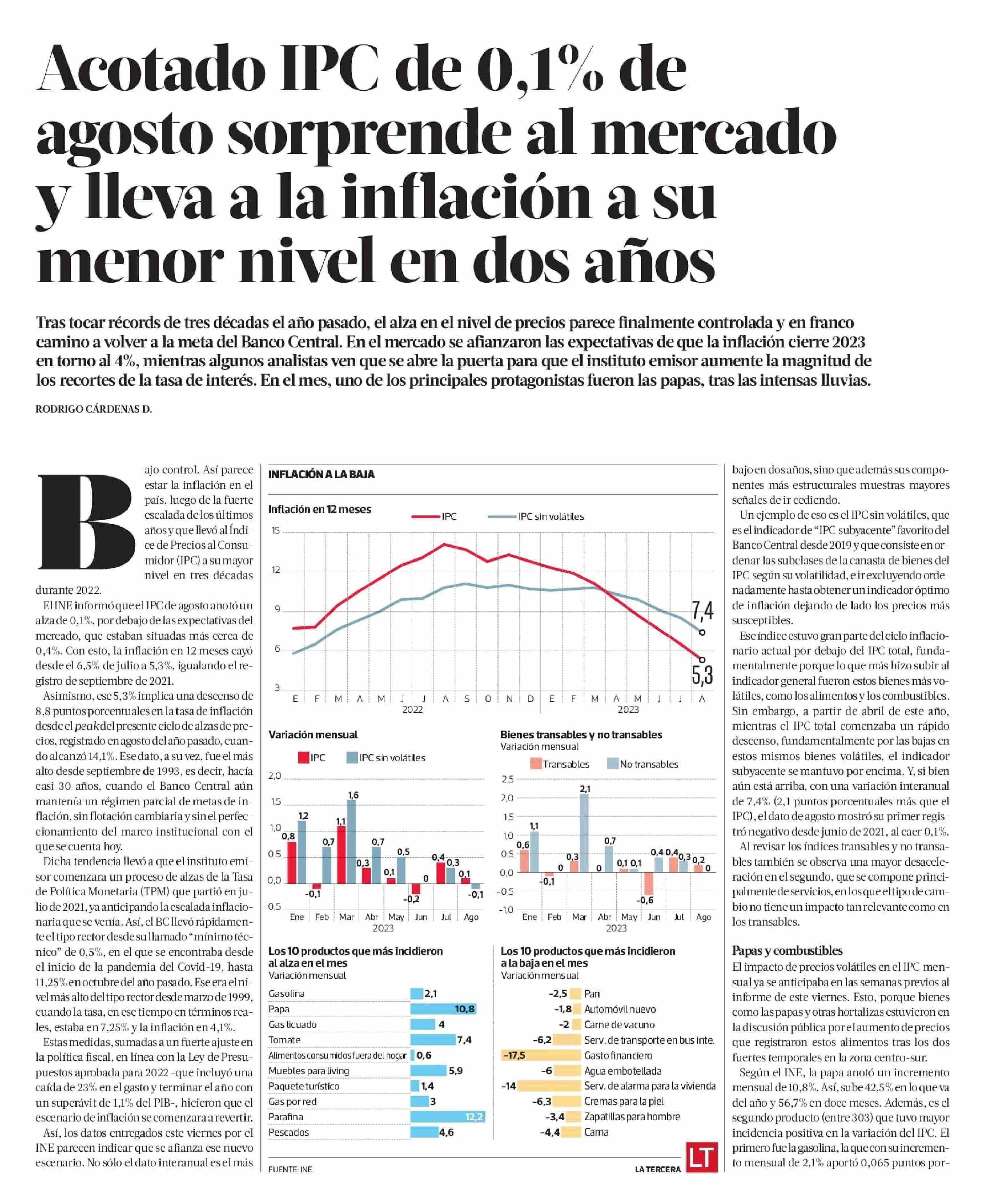 Acotado IPC de 0,1% de agosto sorprende al mercado y lleva a la inflación a su menor nivel en dos años