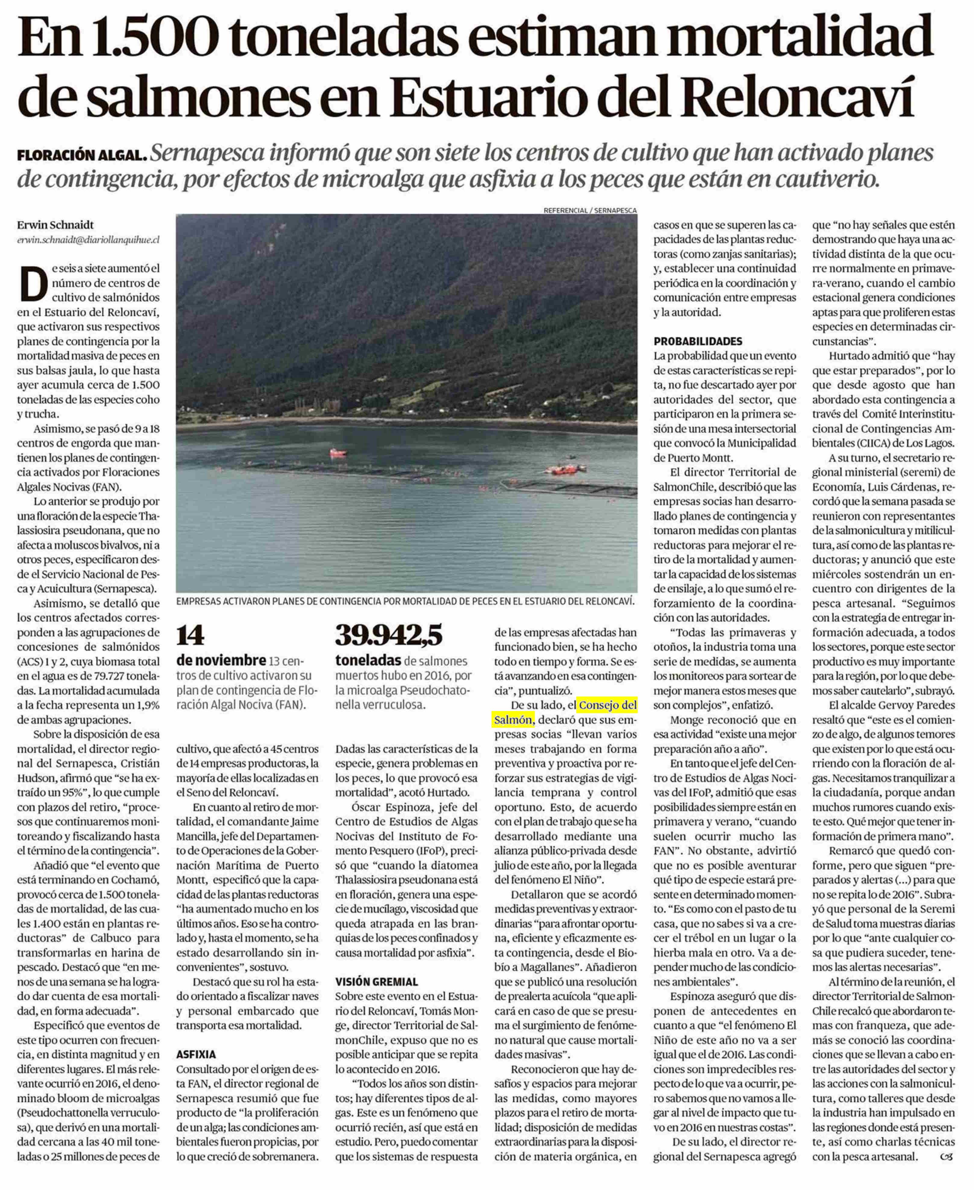 En 1.500 toneladas estiman mortalidad de salmones en Estuario del Reloncaví