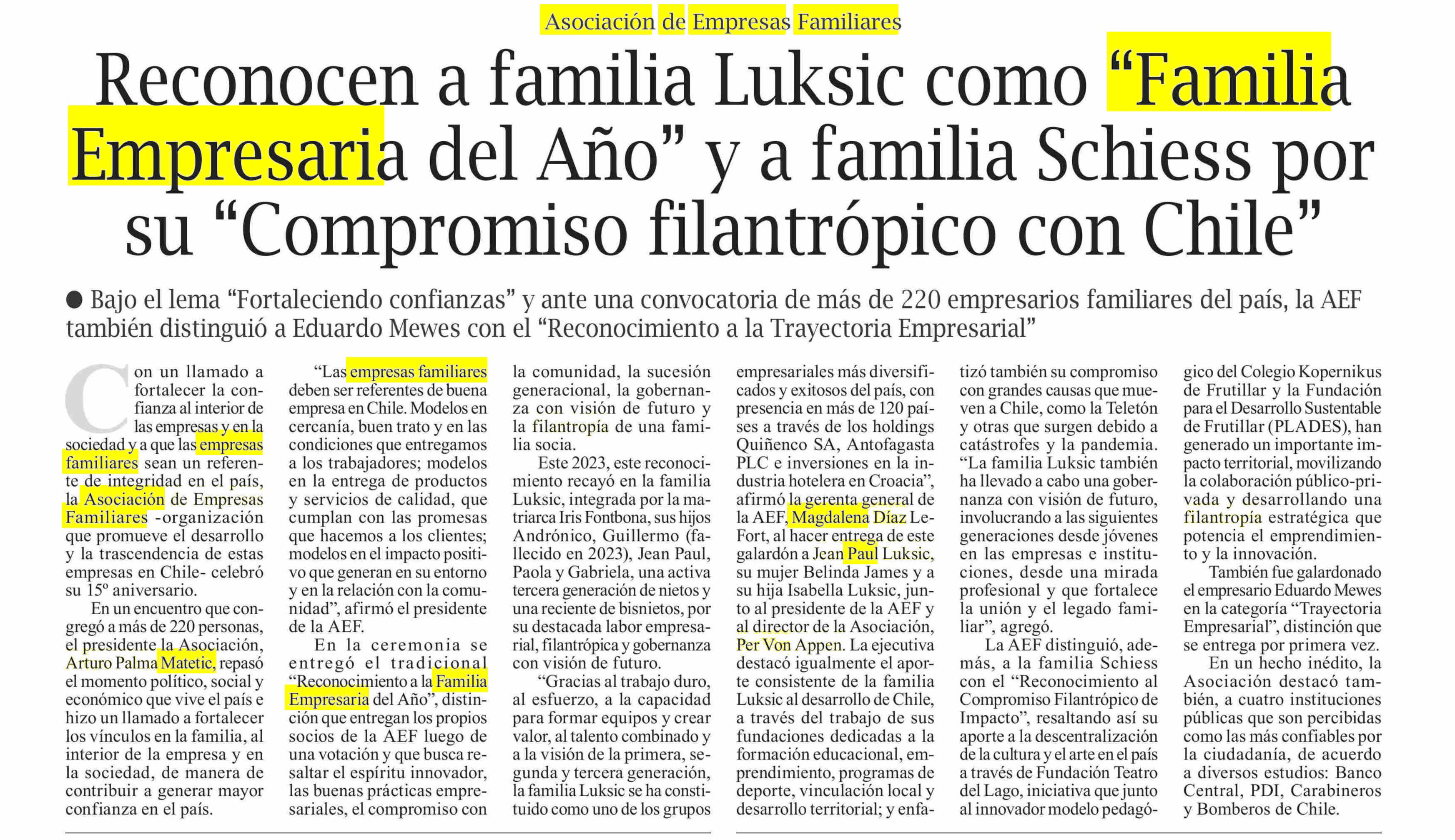 Reconocen a familia Luksic como “Familia Empresaria del Año” y a familia Schiess por su “Compromiso filantrópico con Chile”