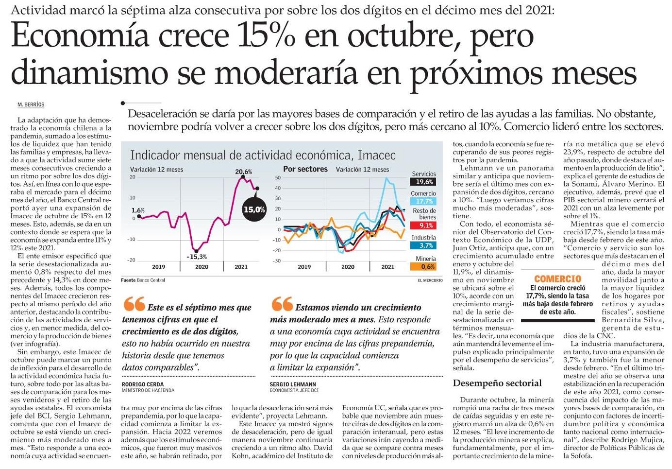 Economía crece 15% en octubre, pero dinamismo se moderaría en próximos meses