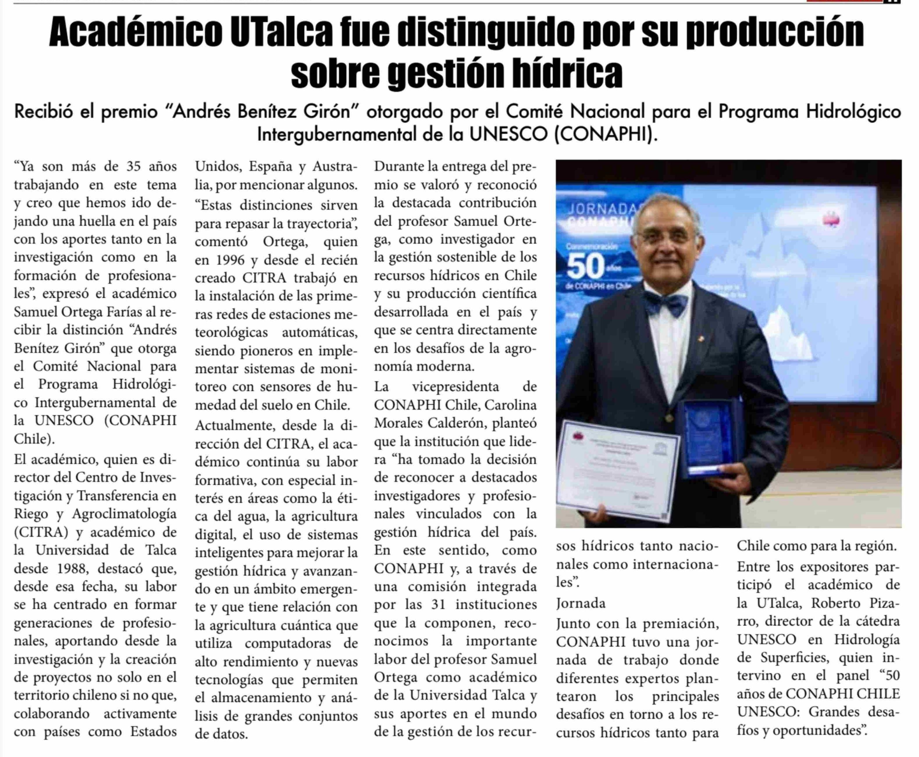 Académico UTalca fue distinguido por su producción sobre gestión hídrica