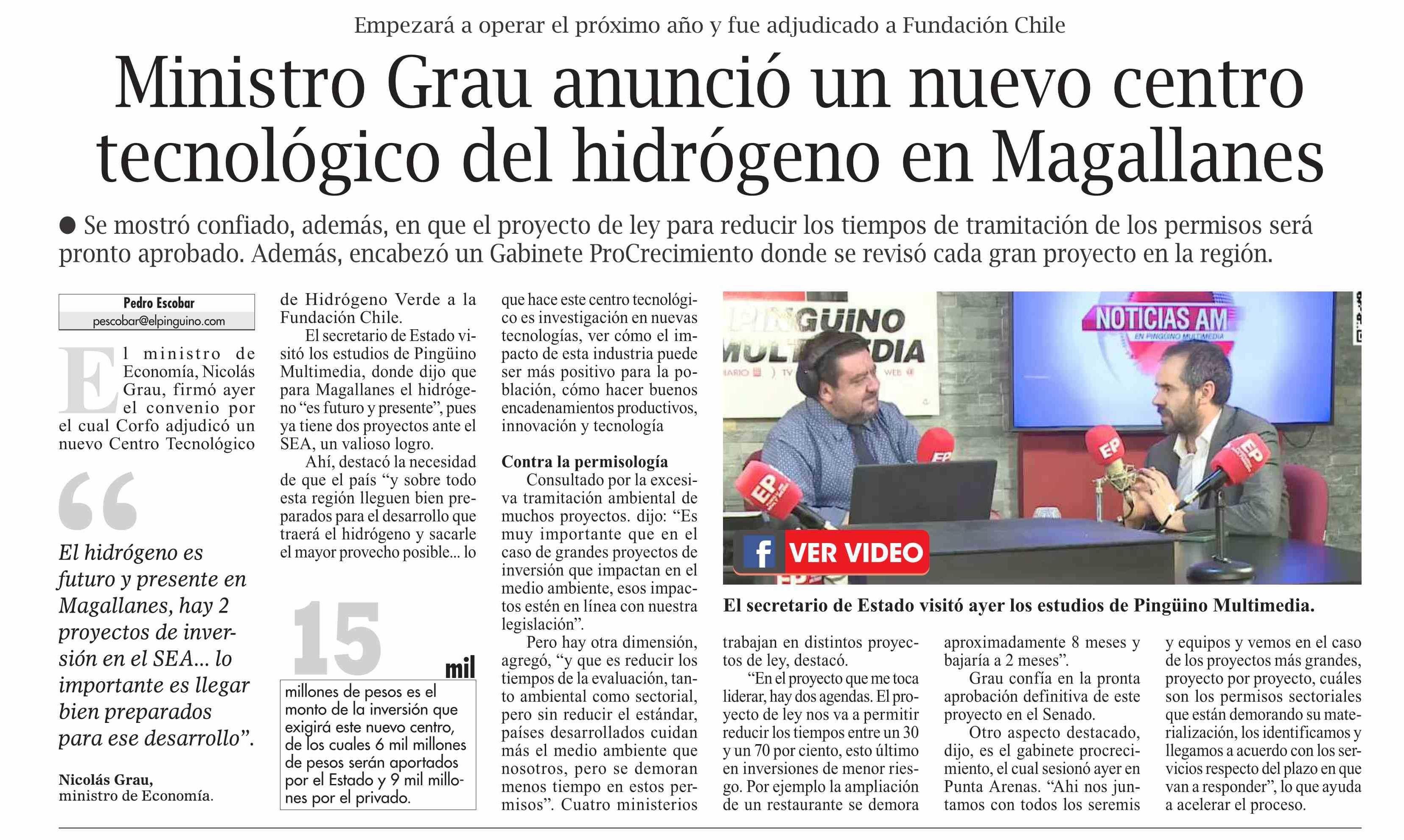 Ministro Grau anunció un nuevo centro tecnológico del hidrógeno en Magallanes