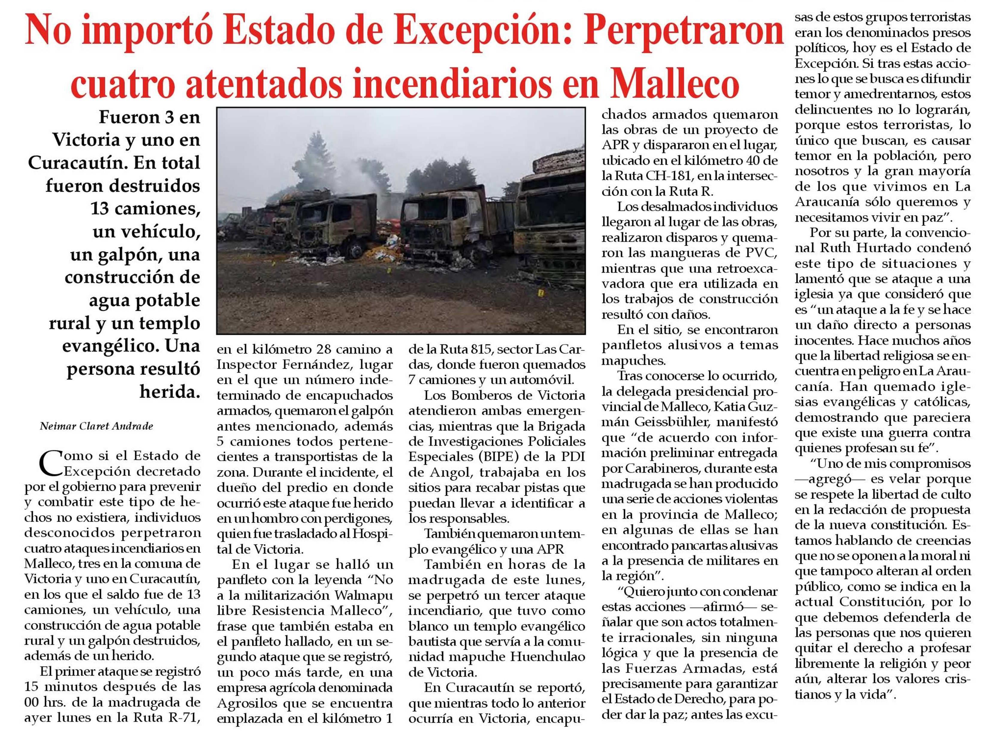 No importó Estado de Excepción: Perpetraron cuatro atentados incendiarios en Malleco