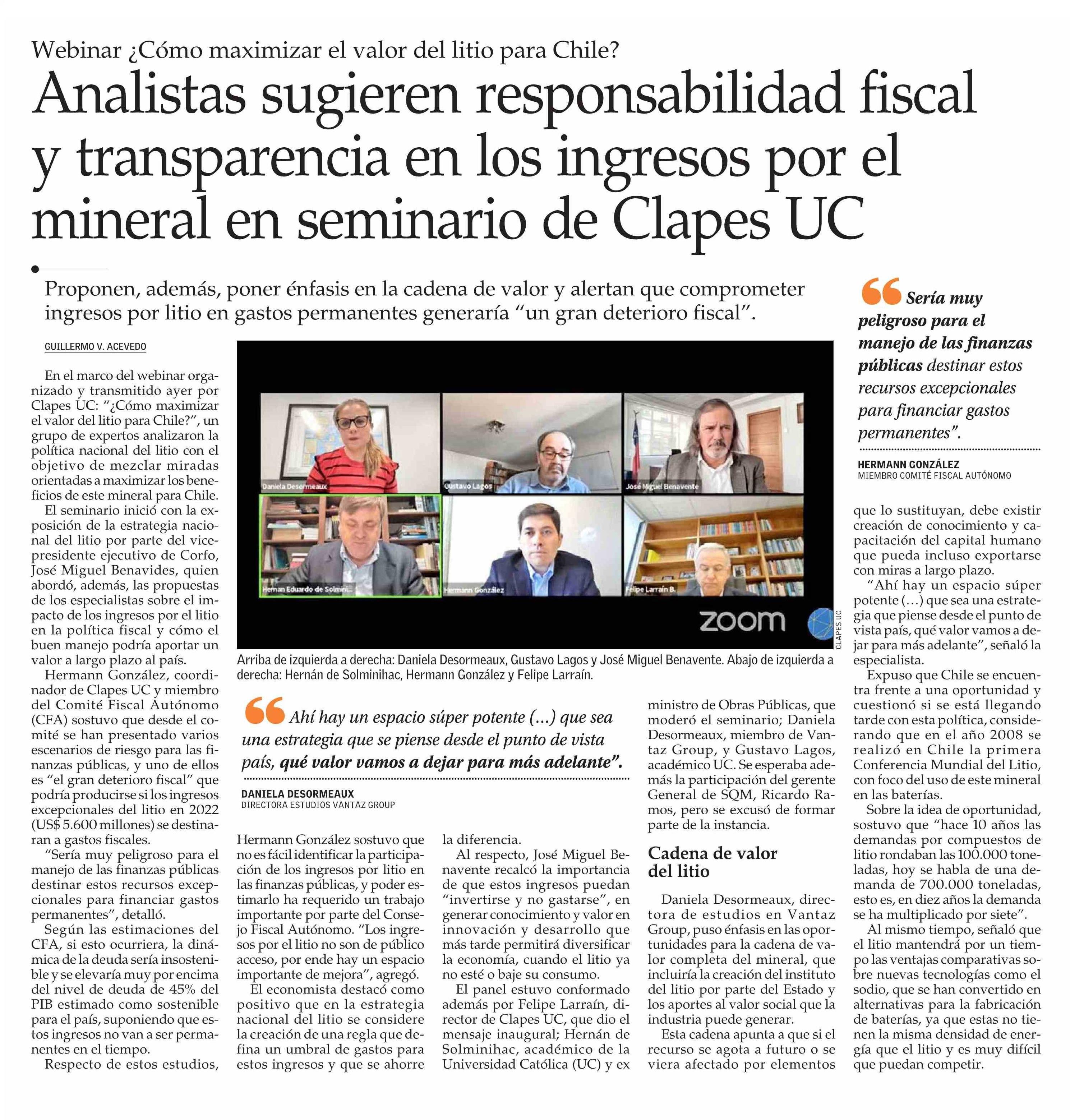 Analistas sugieren responsabilidad fiscal y transparencia en los ingresos por el mineral en seminario de Clapes UC