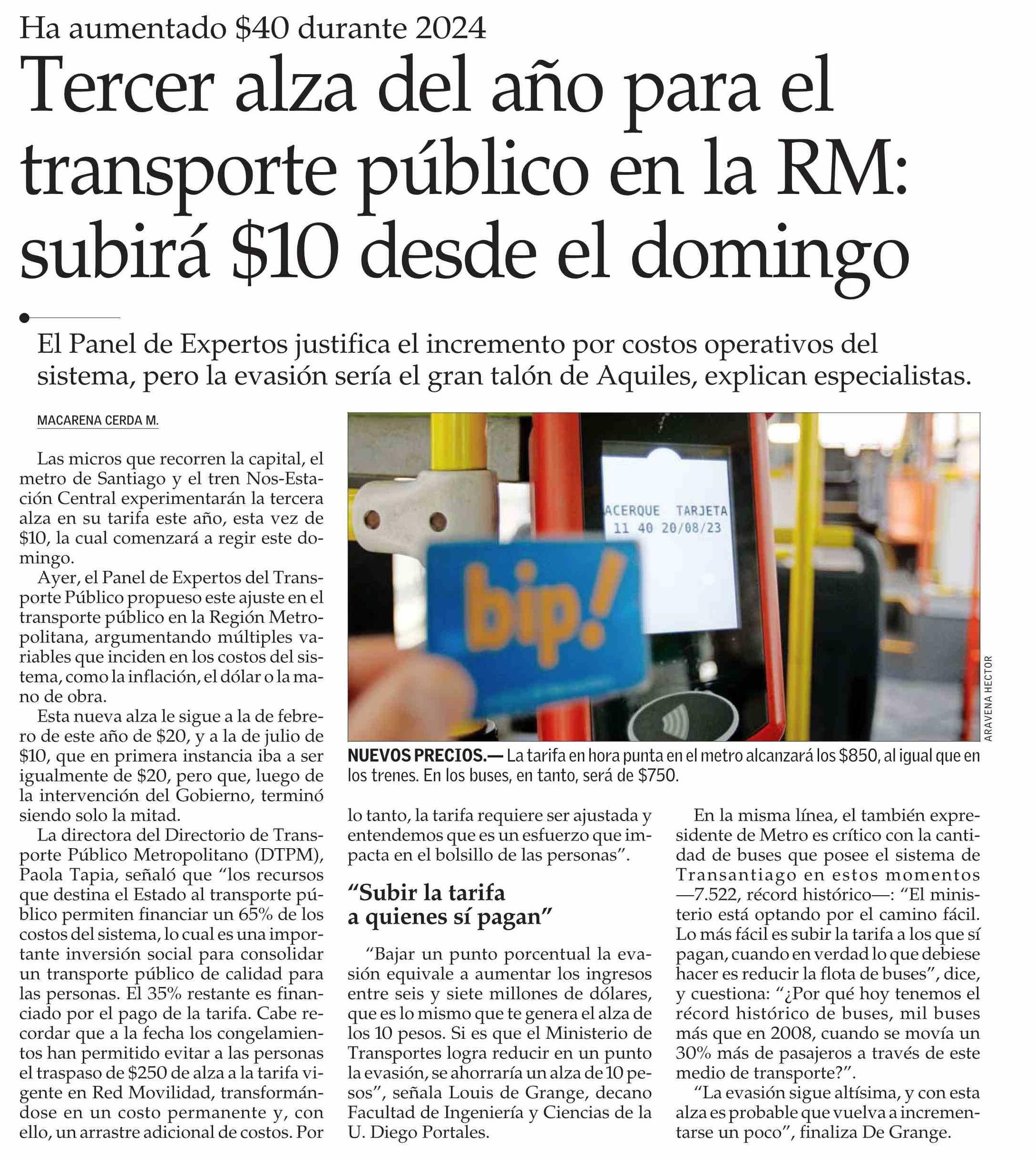 Tercer alza del año para el transporte público en la RM: subirá $10 desde el domingo