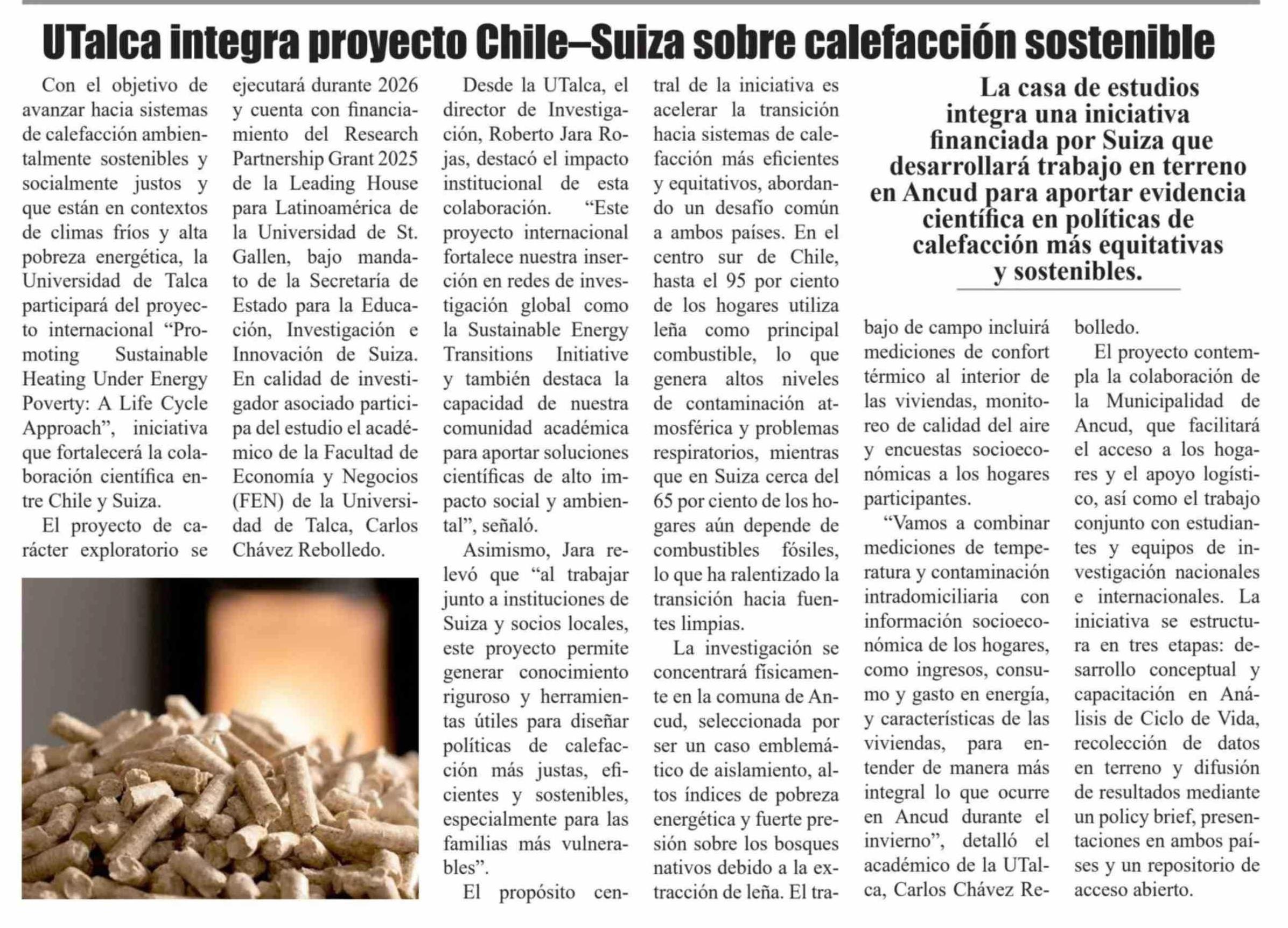 UTalca integra proyecto Chile-Suiza sobre calefacción sostenible